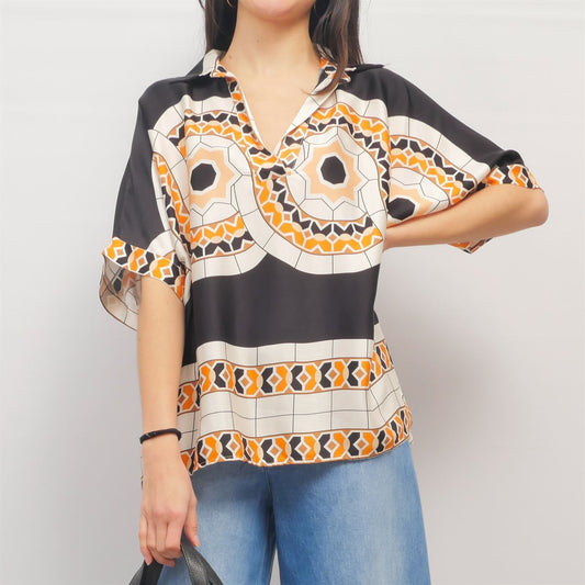 Blouse fluide imprimé géométrique col tunisien KD7607BS-17