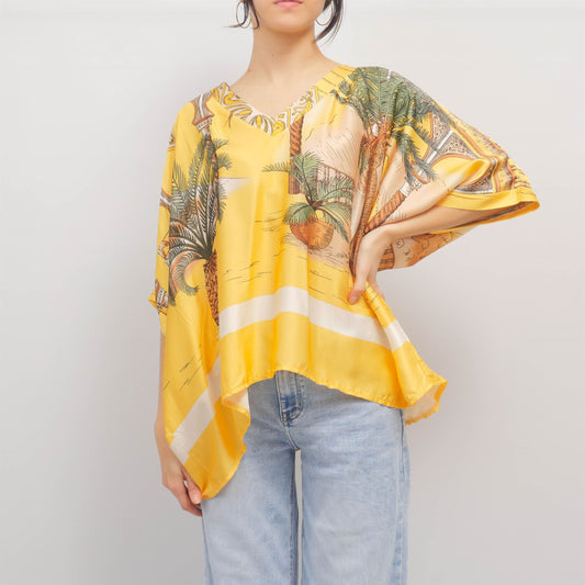 Blouse poncho imprimé oriental fond jaune col V KD8069VS-3