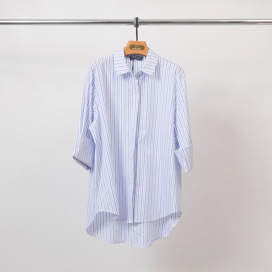 L’intemporel de la garde-robe féminine revisité avec modernité. Cette chemise à rayures bleu ciel séduit...