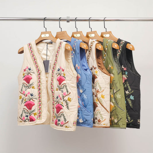 Apportez une touche bohème chic à votre garde-robe avec ce gilet matelassé richement brodé. Confectionné...
