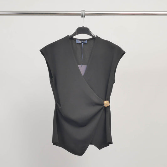 Féminin et audacieux, ce top sans manches sublime la silhouette avec son élégant drapé croisé....