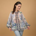 Romantique et élégante, cette blouse imprimée séduit par son motif floral délicat et ses détails raffinés. Son col froncé agrémenté de liens à nouer apporte une touche féminine subtile, tandis que ses manches longues légèrement bouffantes créent un joli volume. Les finitions volantées et l’imprimé inspiré des motifs bohèmes renforcent son charme tout en offrant un mouvement fluide à la silhouette. Facile à associer, elle se porte aussi bien avec un jean pour un look casual chic qu’avec un pantalon élégant pour une allure plus sophistiquée.