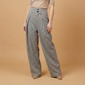 These wide-leg gingham trousers captivate with their graphic appeal and original construction. The structured, double-breasted high waistline accentuates the silhouette, while an asymmetrical draped side panel adds a touch of bold sophistication. The relaxed, flowing cut ensures an elegant drape and optimal everyday comfort. Wear them with a fitted top or a tucked-in blouse to balance proportions and reveal their full character.