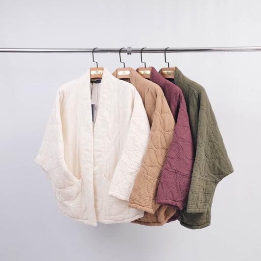 Un souffle bohème et graphique pour cette veste kimono matelassée à l’imprimé inspiré et haut...
