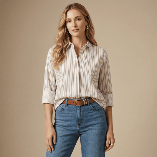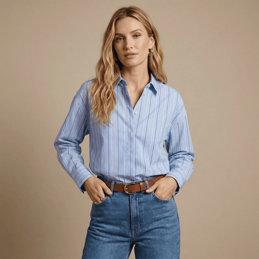 L’intemporel de la garde-robe féminine revisité avec modernité. Cette chemise à rayures bleu ciel séduit...