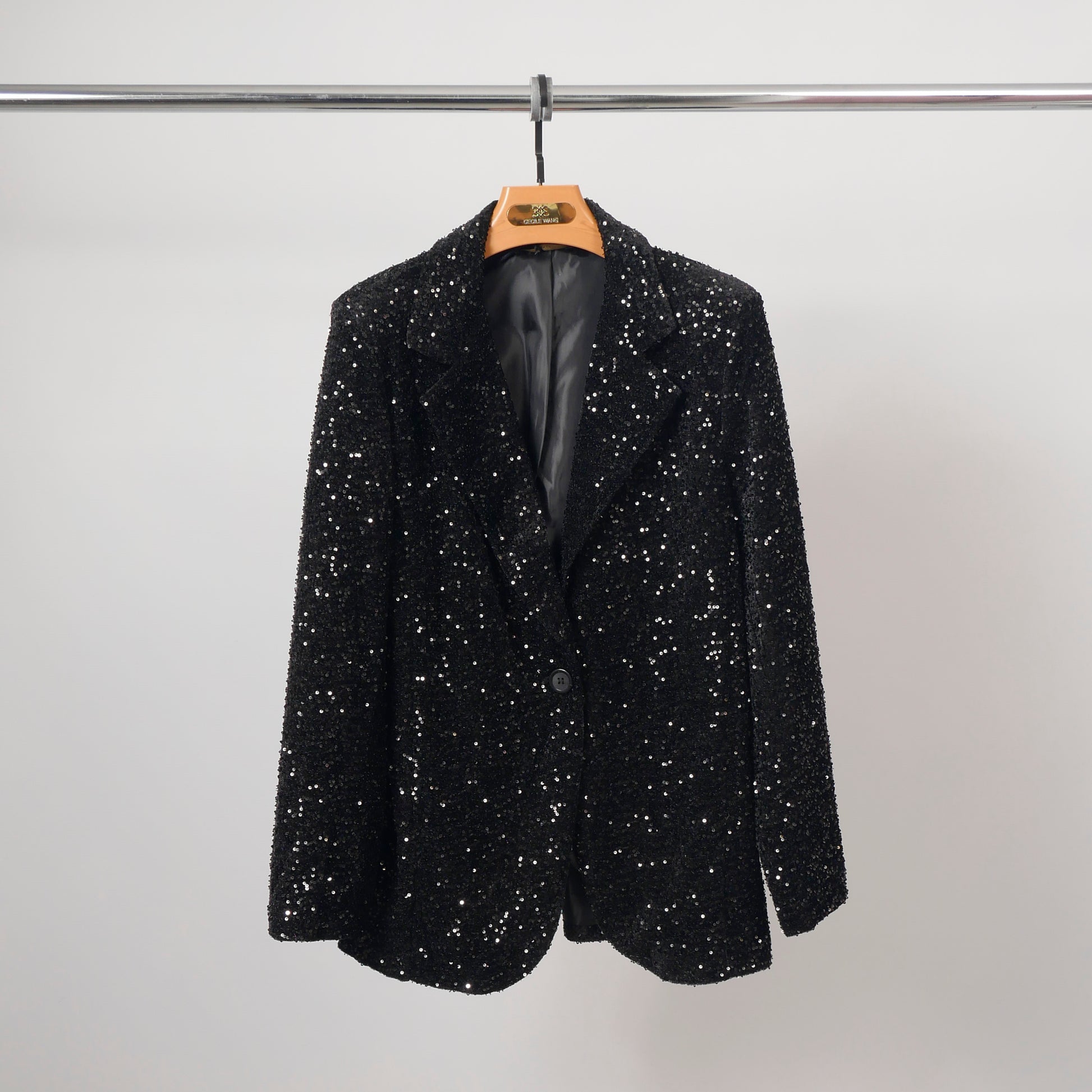Laissez briller vos looks avec ce blazer à paillettes, pensé pour illuminer vos soirées avec audace et élégance. Véritable pièce statement, il combine une silhouette tailleur classique avec une finition entièrement recouverte de sequins noirs pour un effet scintillant irrésistible.