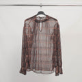Un éclat subtil pour une blouse résolument féminine et raffinée. Ce modèle transparent se distingue par un jeu de plissés verticaux sublimé par des fils métallisés cuivrés, qui captent la lumière à chaque mouvement. Le col montant froncé, la goutte d’eau délicate à l’encolure et les poignets volantés apportent une touche de romantisme sophistiqué. Sa coupe fluide assure un tombé léger, parfait pour des looks élégants du jour à la nuit.