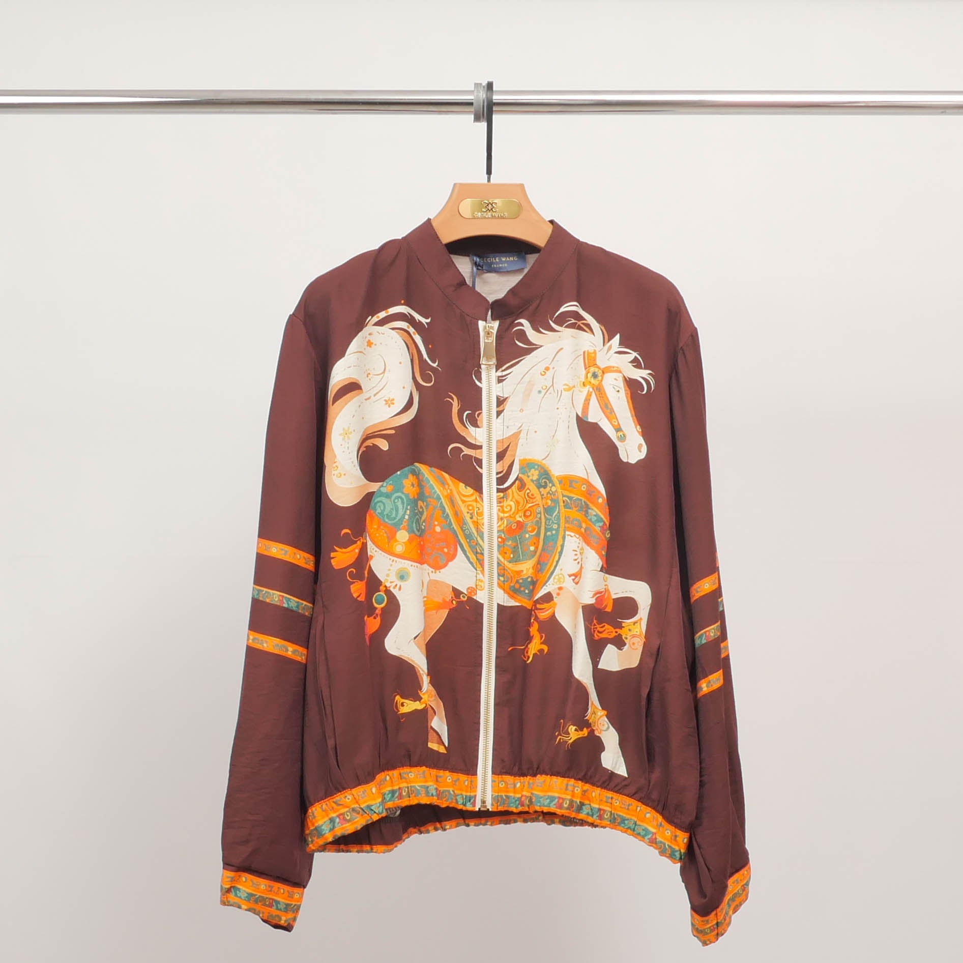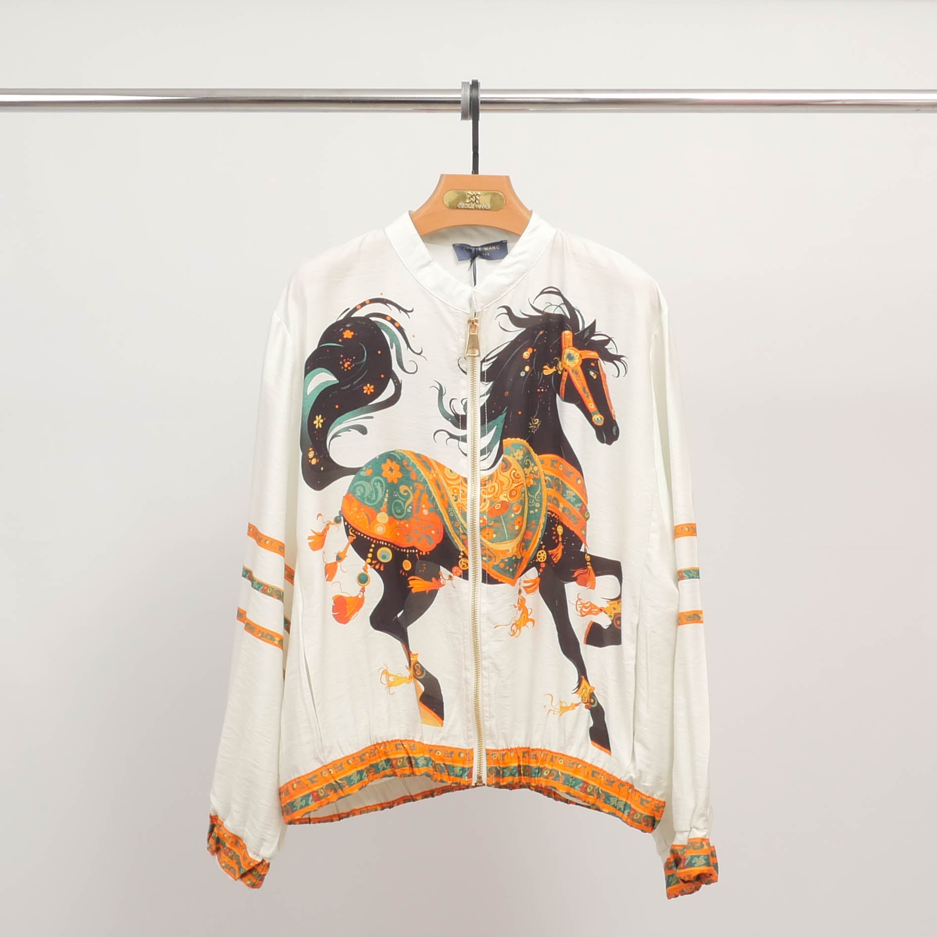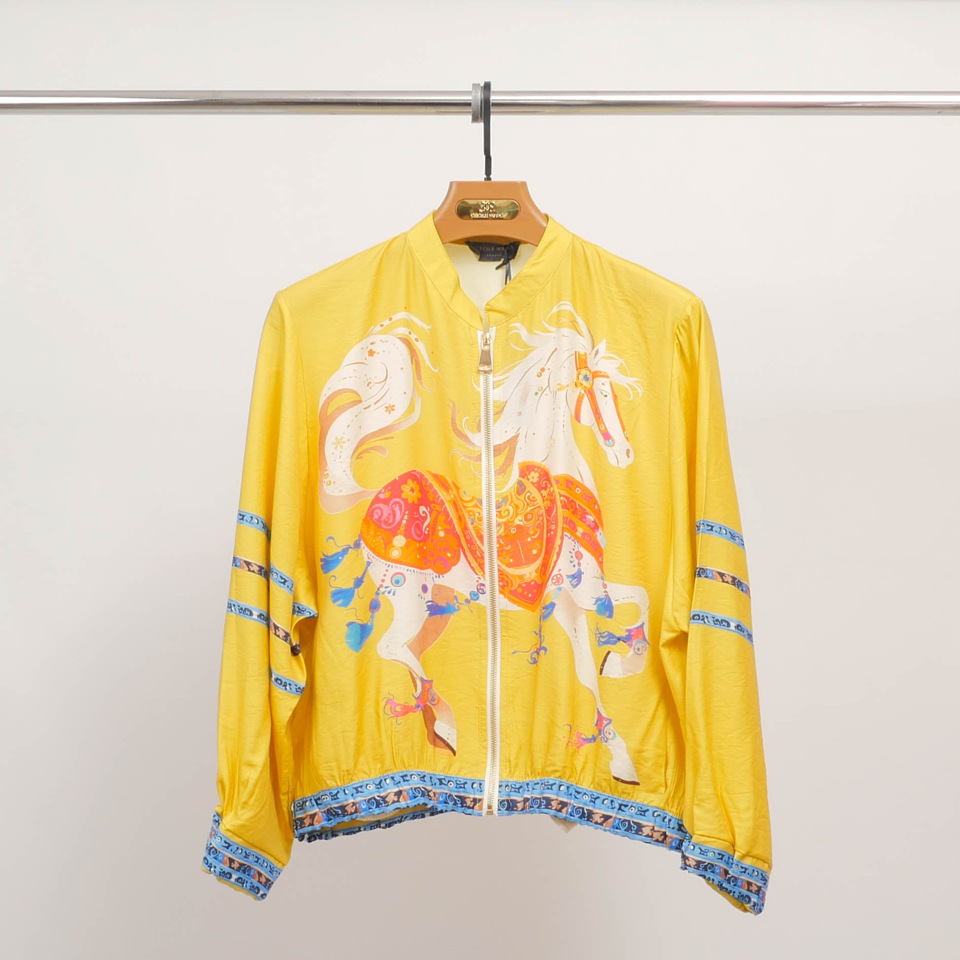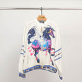 Affirmez votre style avec ce blouson à l'imprimé cheval spectaculaire, une pièce forte qui capte tous les regards. Son visuel vibrant met en scène un cheval ornementé aux allures mythologiques, décliné dans une palette riche et contrastée. La coupe ample à col montant zippé assure une allure décontractée et contemporaine, tandis que les bandes décoratives aux manches et à la base ajoutent une touche graphique unique. Léger et fluide, ce blouson en Tencel offre un tombé souple très agréable à porter, idéal pour les mi-saisons. Portez-le sur un jean brut ou une jupe fluide pour un look audacieux et assumé.