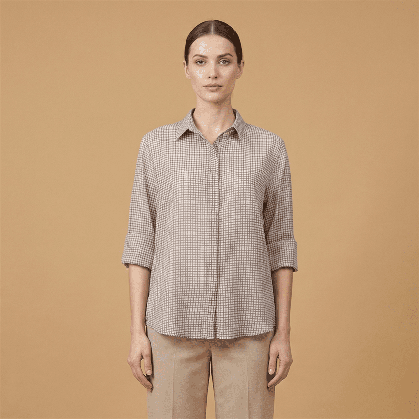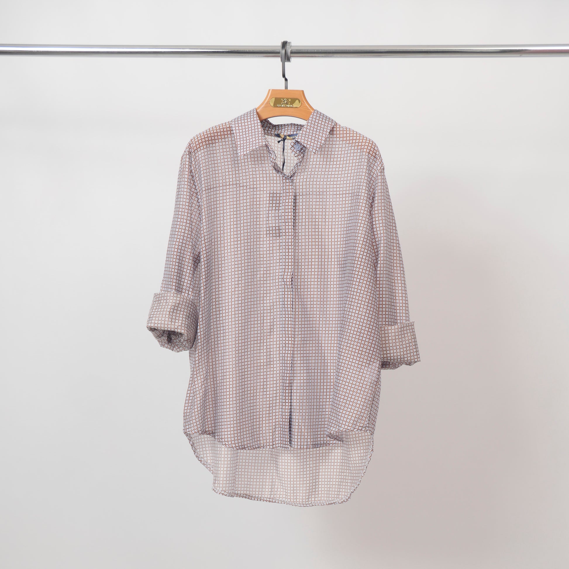 Sa coupe ample et légèrement arrondie à la base crée une silhouette décontractée mais toujours élégante. Le motif à petits carreaux apporte une touche graphique discrète, tandis que la matière en Tencel mélangé offre un tombé souple, une sensation douce sur la peau et une belle tenue tout au long de la journée. Les manches longues retroussables ajoutent une touche de polyvalence idéale pour la mi-saison.
