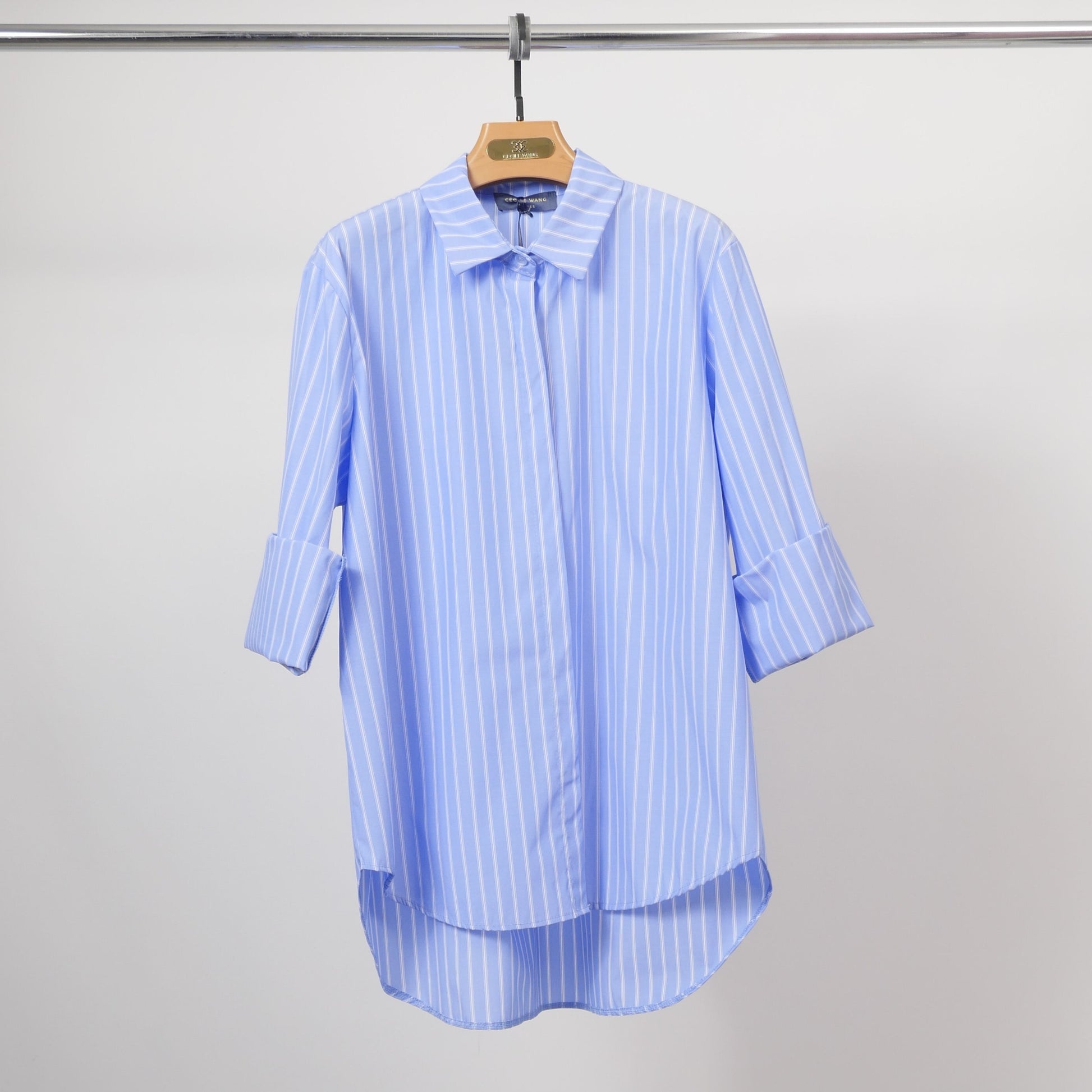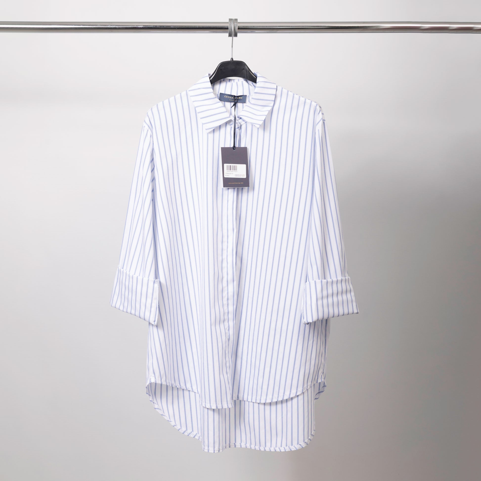 Confectionnée en coton stretch pour un confort optimal, elle arbore une coupe oversize avec un ourlet asymétrique, plus long à l’arrière, qui apporte une touche contemporaine. Ses rayures verticales allongent la silhouette et son col classique structure l’ensemble. Les manches longues retroussées ajoutent une note décontractée. Parfaite pour jouer sur les contrastes, elle se porte aussi bien avec un jean slim qu’avec un pantalon de tailleur pour une allure chic et décontractée.