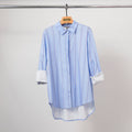 Une chemise pleine de caractère pour twister vos looks du quotidien. Ce modèle bleu à rayures multicolores combine une coupe ample et un design raffiné pour un équilibre parfait entre confort et style. Son col classique, sa fermeture dissimulée et ses poignets contrastants blancs lui apportent une finition élégante. Le bas arrondi plus long dans le dos structure la silhouette tout en assurant une liberté de mouvement. Idéale portée seule avec un pantalon droit, ou ouverte sur un top uni pour un effet superposé moderne.