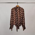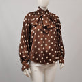 Élégante et pleine de caractère, cette chemise satinée à pois revisite le classique col lavallière avec une touche vintage affirmée. Son tissu fluide en satin de viscose met en valeur un imprimé à pois intemporel sur fond chocolat, tandis que les manches longues à poignets noués ajoutent une note sophistiquée. La coupe ample assure un tomber souple et flatteur, idéal pour allier confort et allure. Portez-la rentrée dans un pantalon taille haute pour un look chic de bureau, ou laissez-la fluide sur un jean pour une silhouette plus décontractée mais toujours raffinée.