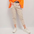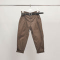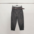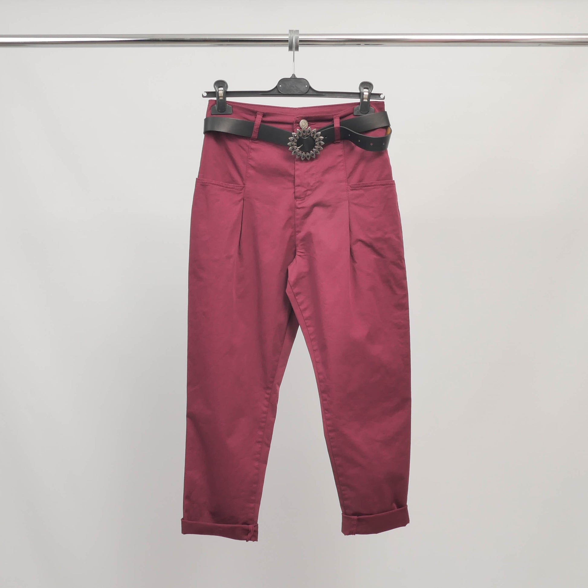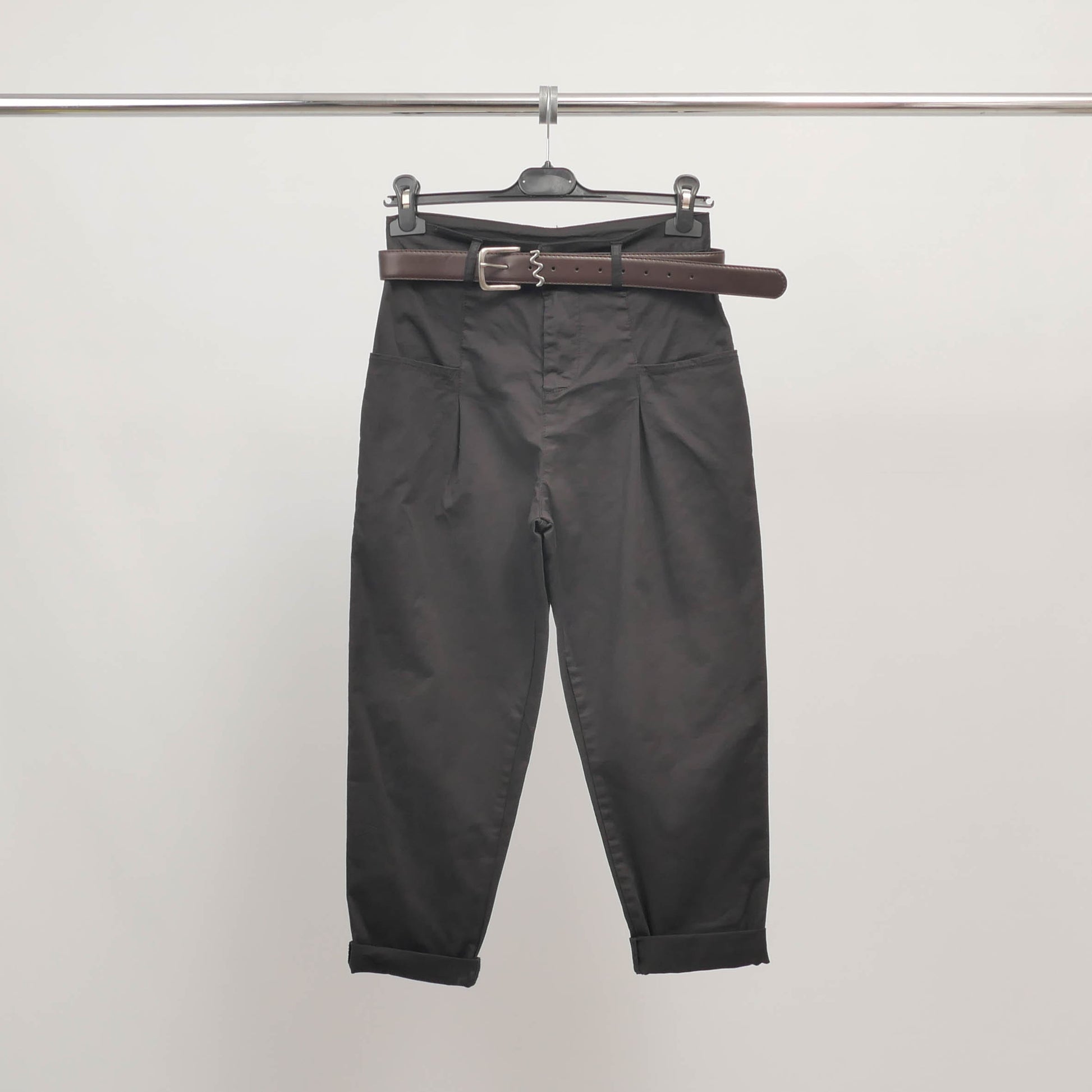Ce pantalon taille haute adopte une coupe carotte flatteuse, soulignée par une ceinture décorative ornée d'une boucle bijou qui apporte une note chic et originale. Les pinces sur le devant structurent la silhouette, tandis que les revers en bas de jambe apportent une finition soignée et moderne.