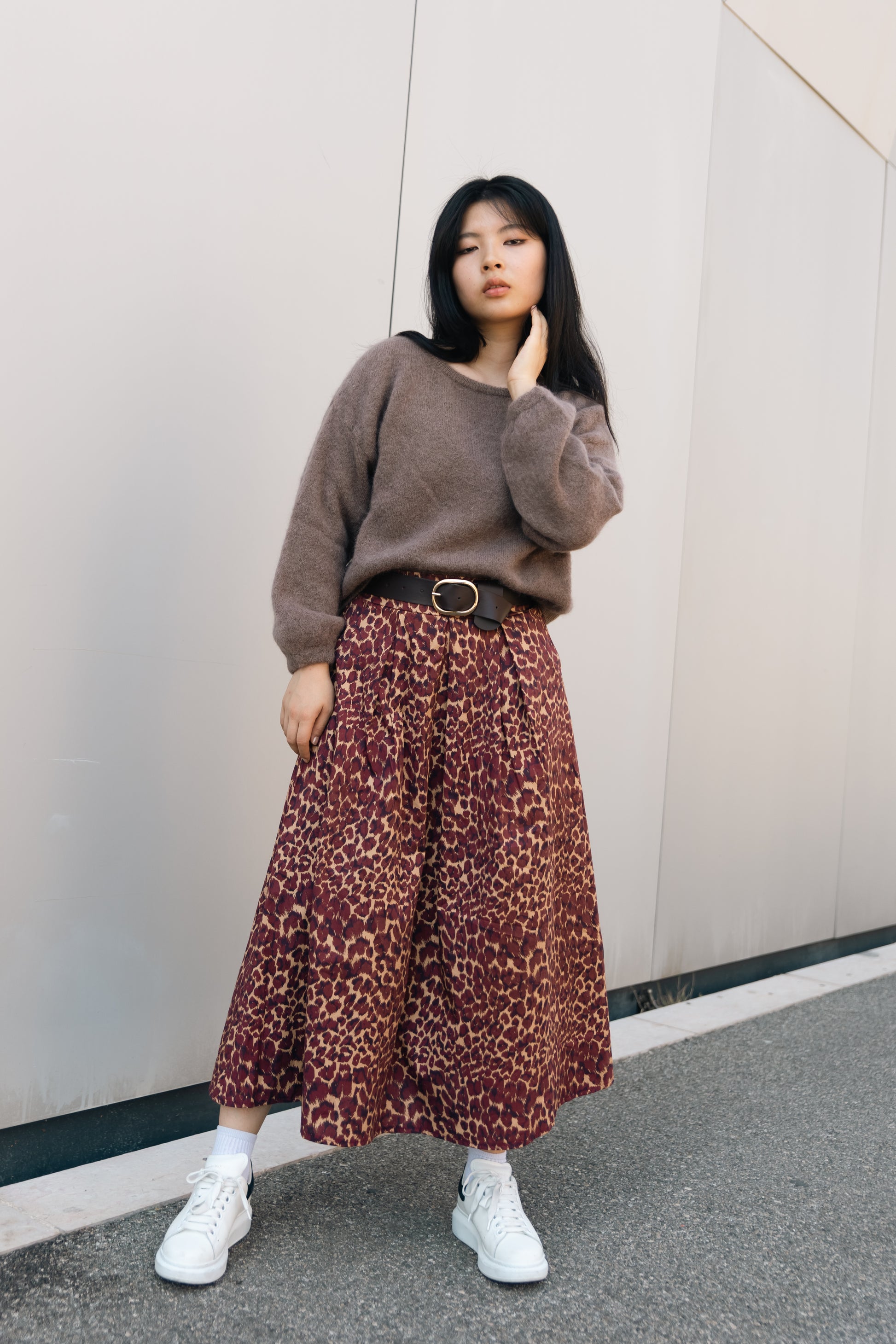 Dotée de plis souples et d’une coupe évasée, elle se distingue par son imprimé animalier bicolore audacieux et sa ceinture en similicuir marron à boucle dorée, apportant structure et élégance.