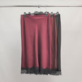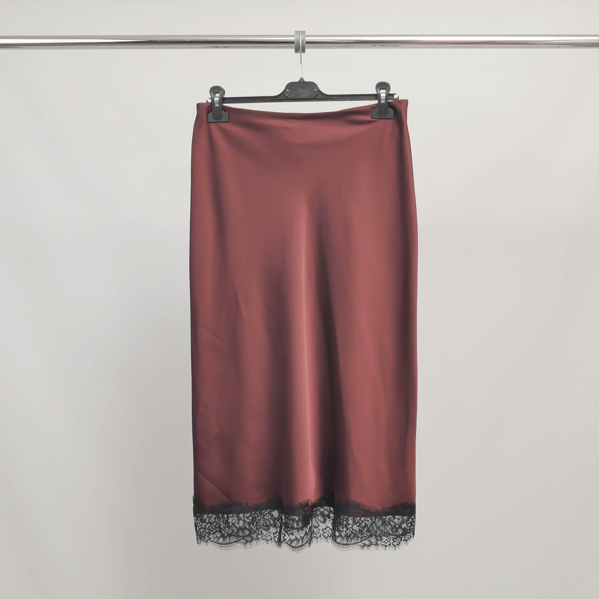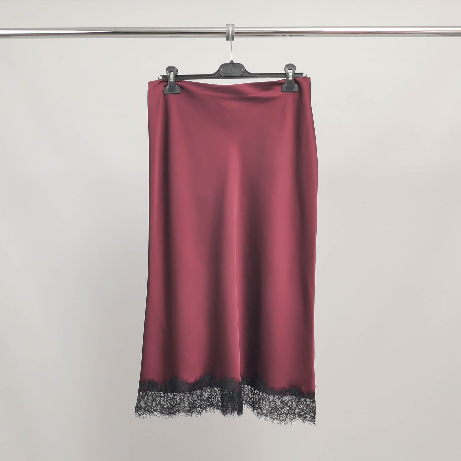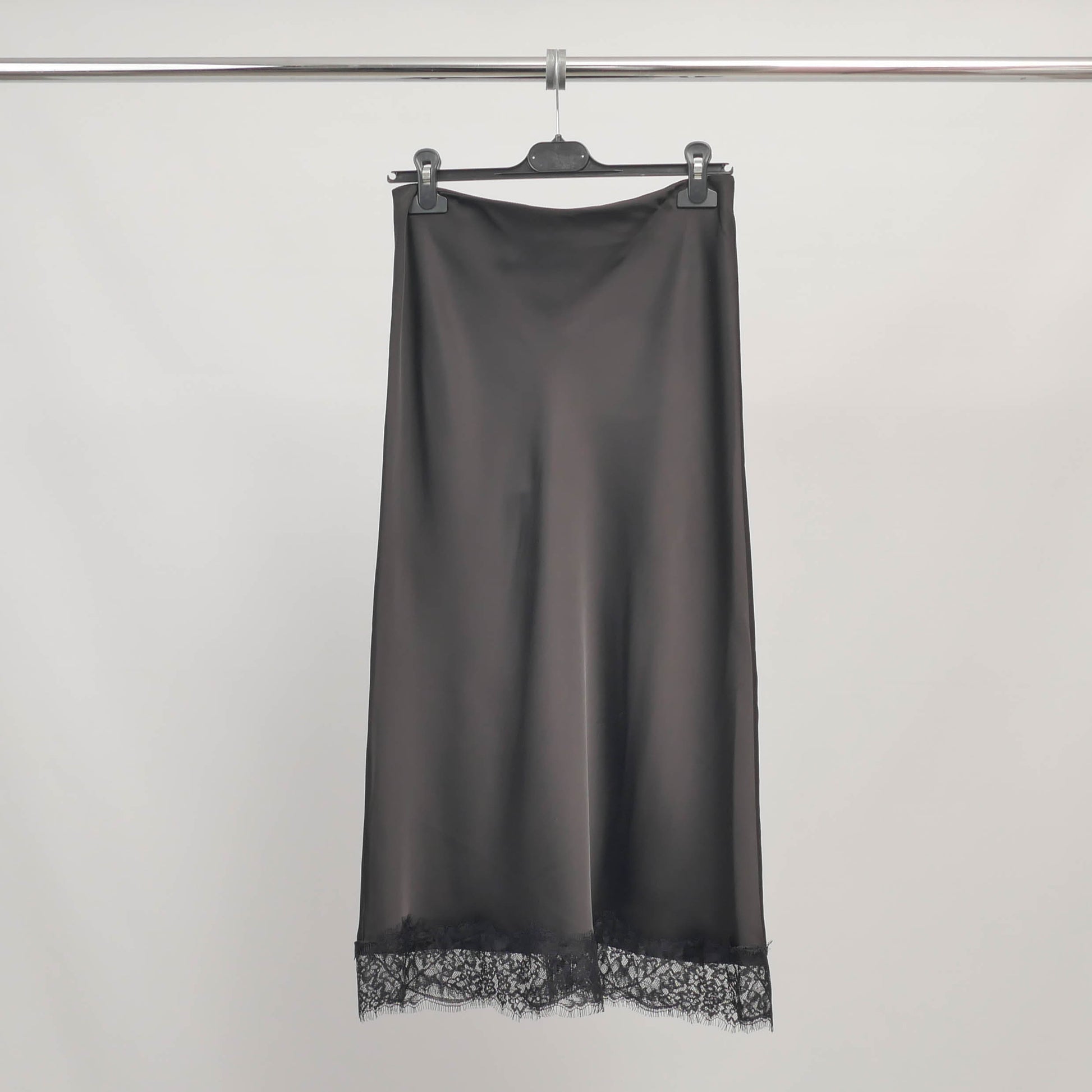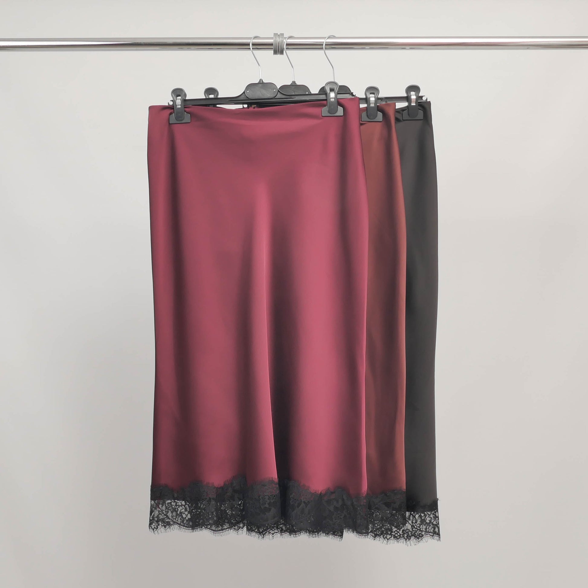 Élégante et sensuelle, cette jupe satinée incarne la féminité dans sa version la plus raffinée. Son tissu fluide au fini brillant caresse la silhouette, tandis que sa coupe droite mi-longue allonge la jambe avec subtilité. Le détail en dentelle noire délicatement cousu à l’ourlet apporte une touche lingerie assumée, pour un look à la fois chic et audacieux. À porter avec un pull oversize pour un contraste de textures ou avec une blouse soyeuse pour une allure ultra sophistiquée.