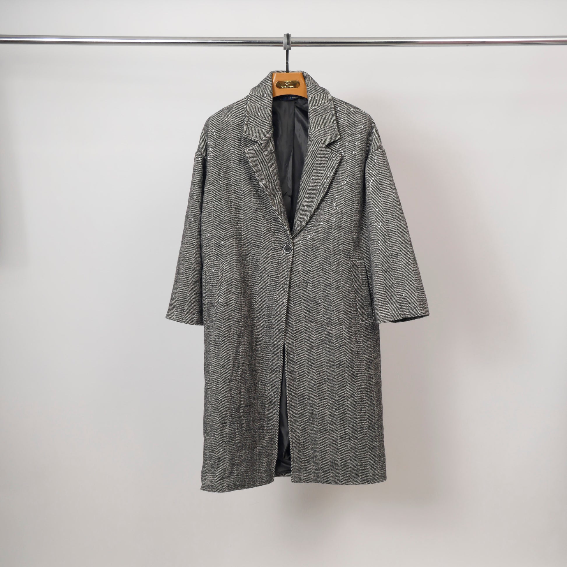 Brillez tout en élégance avec ce manteau long à sequins, idéal pour rehausser vos looks d’hiver avec une touche subtile de lumière.