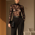 Un jeu de transparence raffiné pour une allure féminine et audacieuse. Ce top en tulle fin séduit par sa broderie florale délicate aux tons bordeaux et noirs, qui crée un subtil contraste sur la peau. Sa coupe ajustée, son col montant et ses manches longues en font une pièce élégante à superposer.
