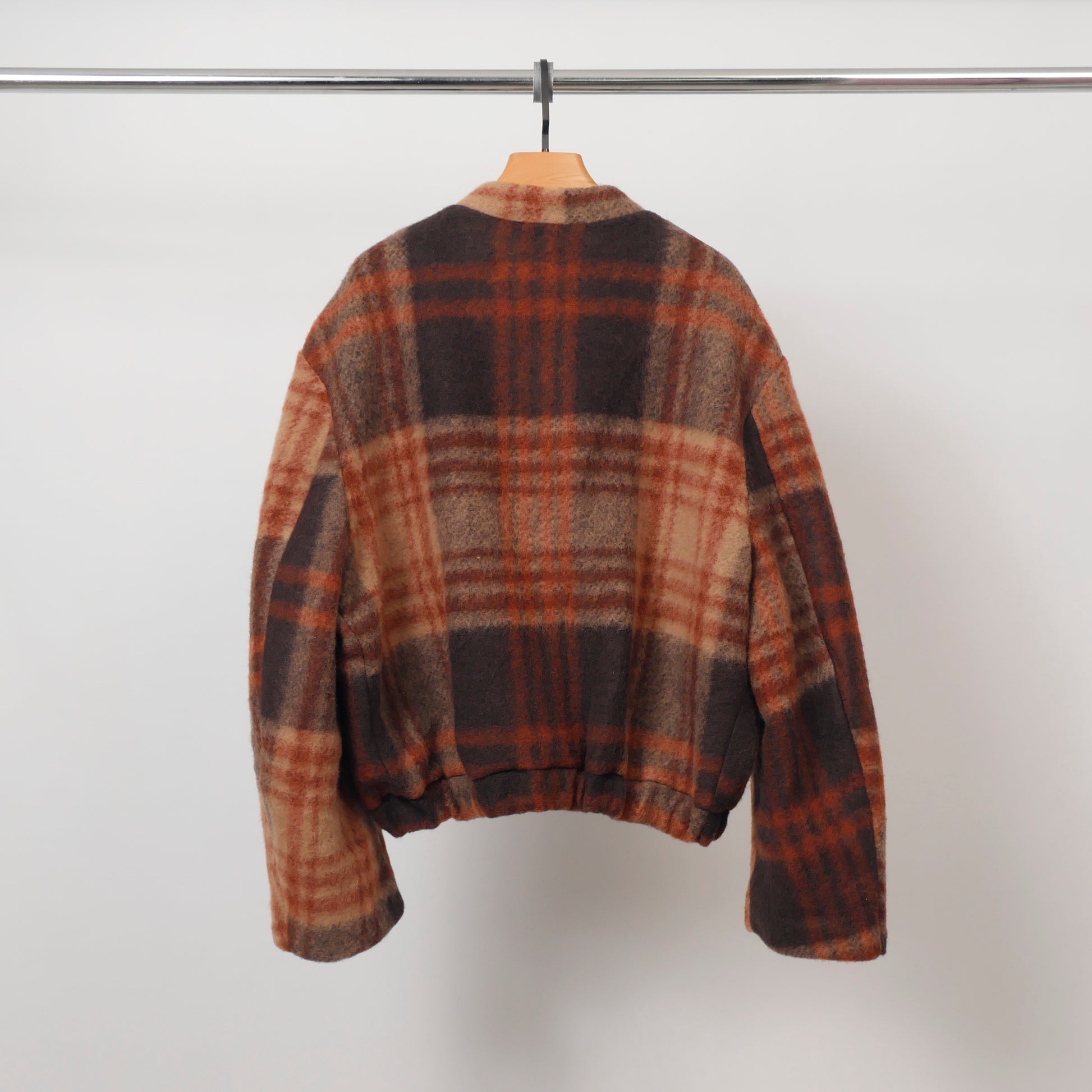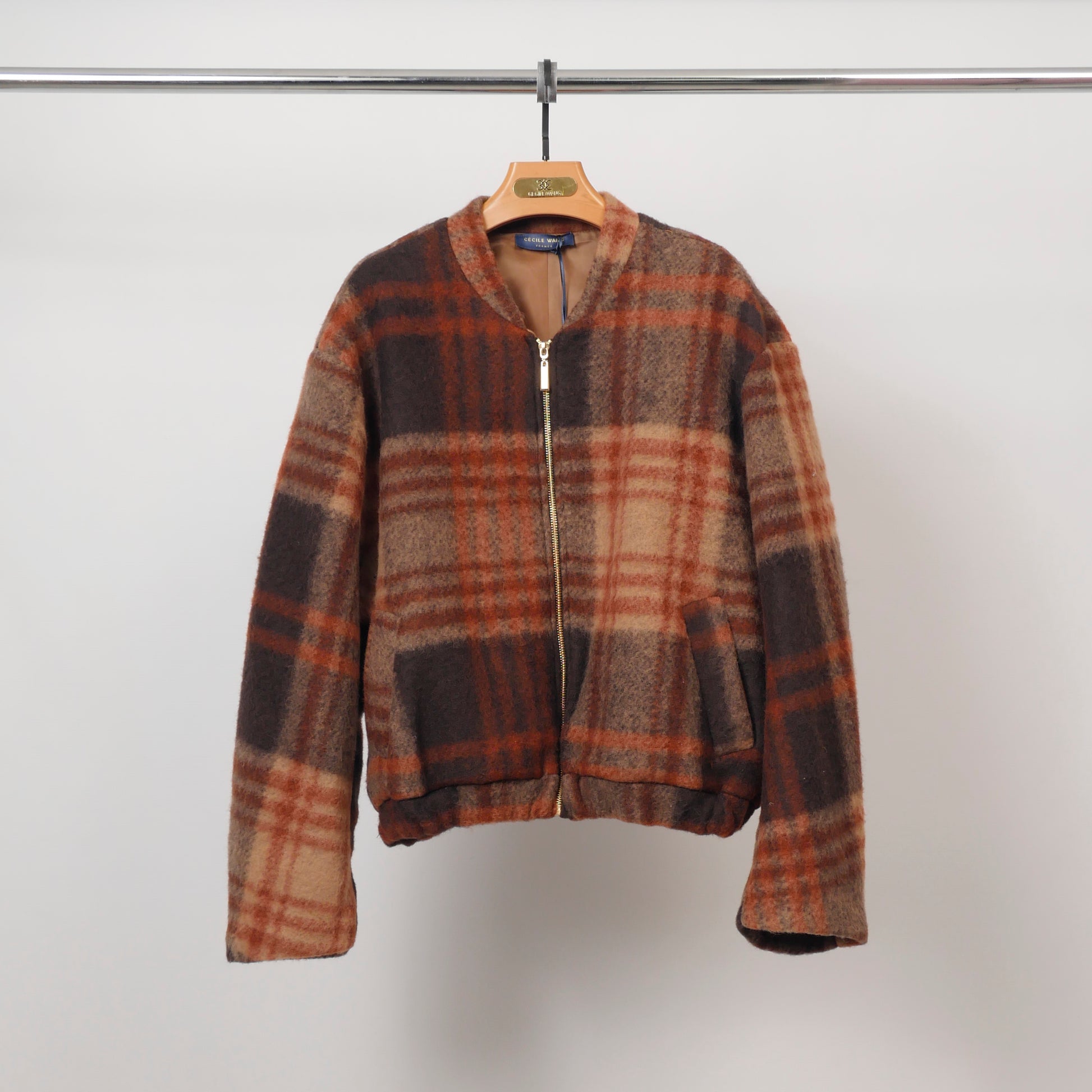 Ce modèle revisite le bomber classique dans une version en laine mélangée, avec un motif à grands carreaux dans des tons chaleureux de brun, beige et rouille. Il présente une coupe légèrement ample, un col rond façon teddy, une fermeture zippée métallique dorée et une base élastiquée pour une silhouette décontractée mais structurée.