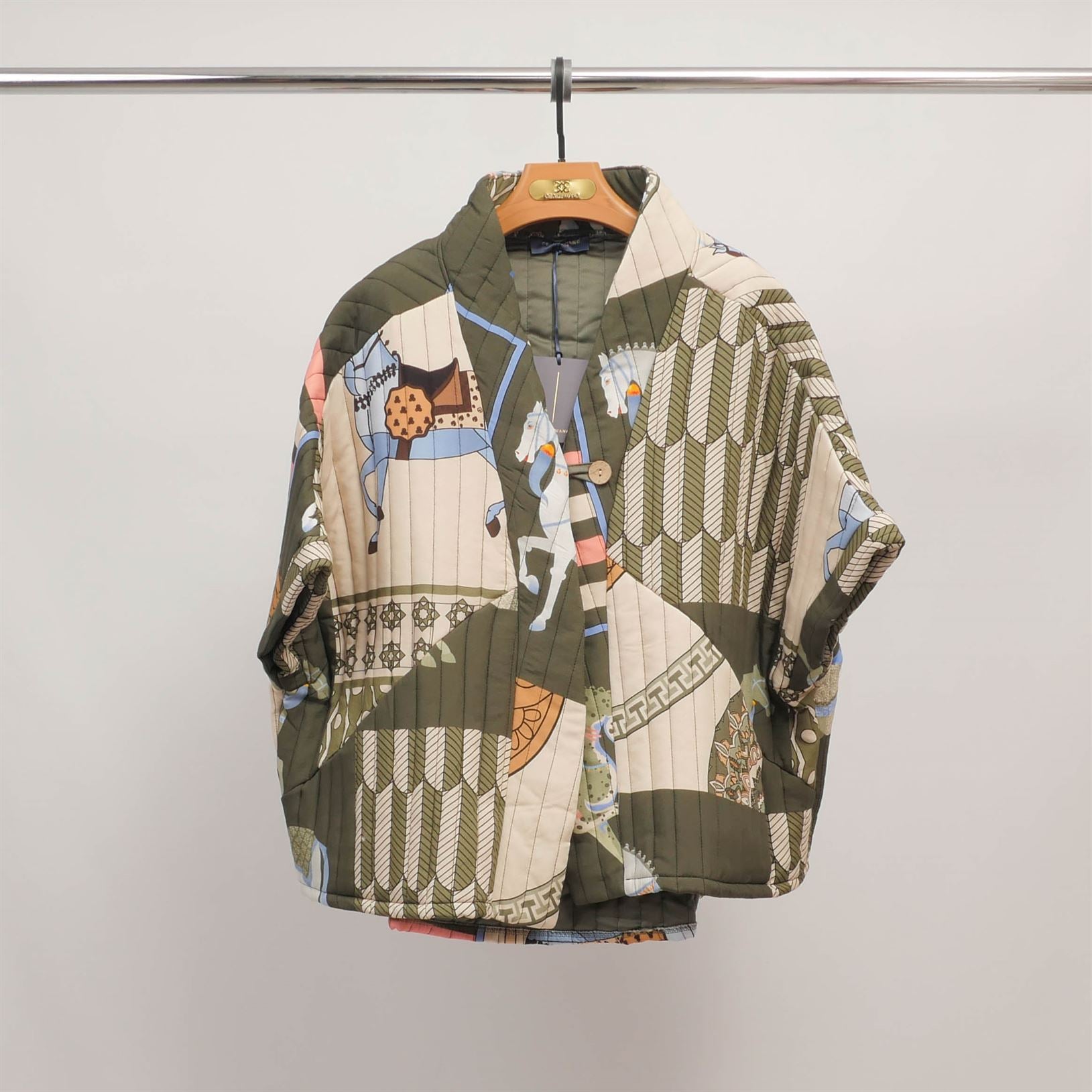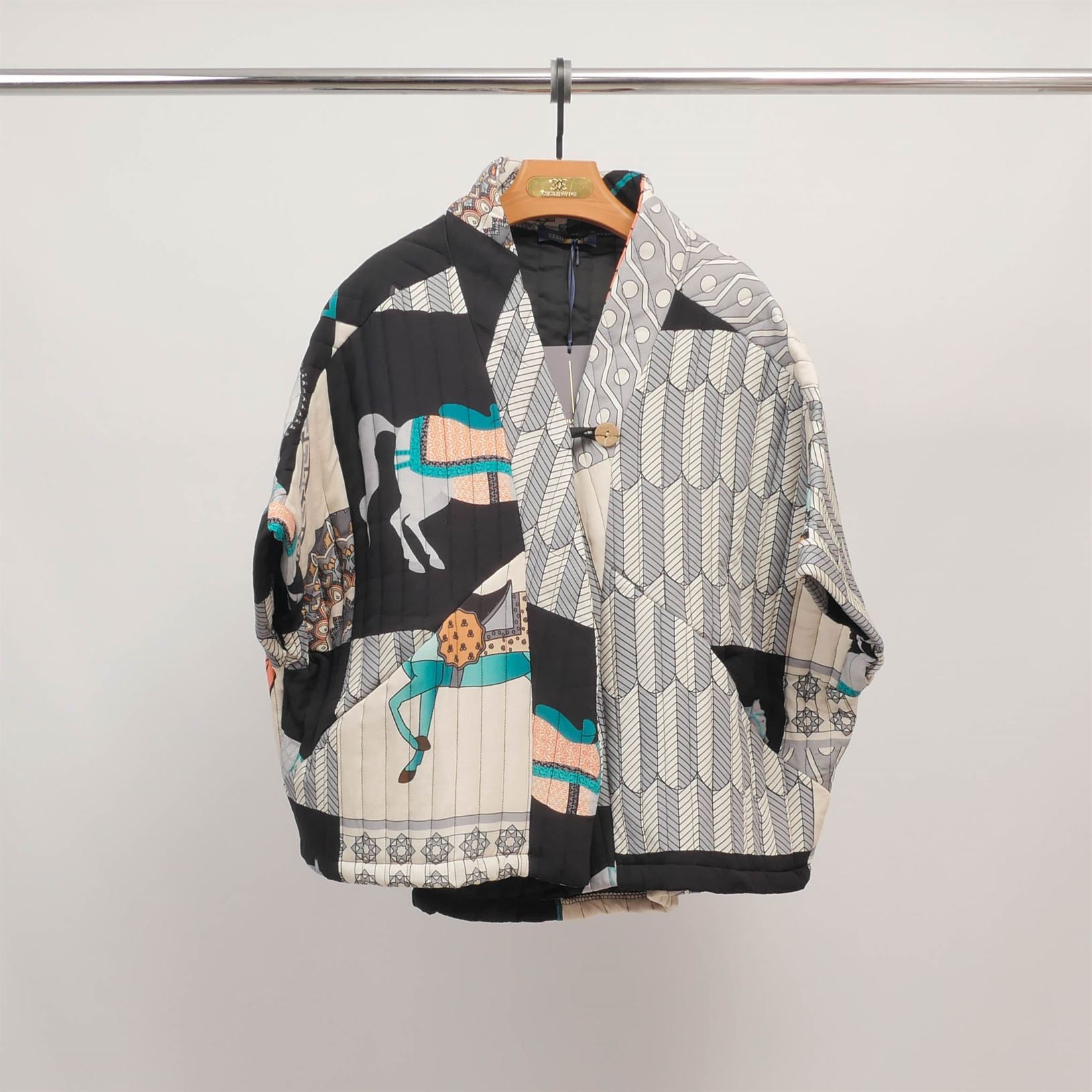 Dotée d’une coupe ample courte et de manches courtes à revers, elle séduit par son col châle croisé, sa fermeture à deux boutons décalés et ses motifs contrastés évoquant un univers équestre revisité. Le matelassage vertical apporte de la structure tout en conservant souplesse et légèreté.