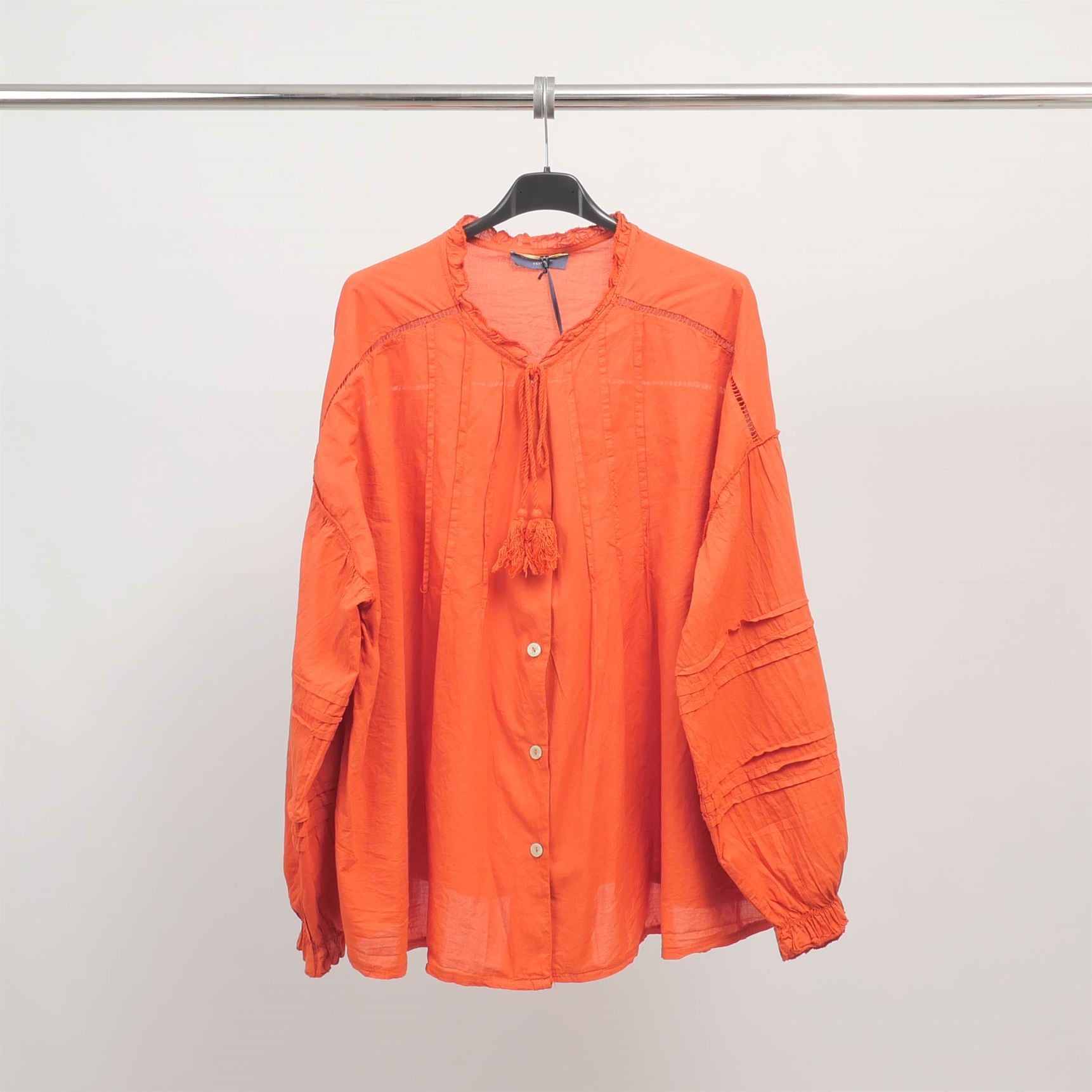 Un charme bohème souffle sur cette blouse fluide au caractère affirmé. Confectionnée en coton léger, elle se distingue par son col fendu orné de liens à pompons et ses manches longues bouffantes sublimées de plissés délicats et jours échelle. Sa coupe ample assure une silhouette aérienne et confortable, parfaite pour la belle saison.
