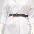 Confectionnée en cuir pleine fleur, elle se distingue par une finition lisse, une boucle dorée élégante et deux passants ton sur ton qui renforcent sa tenue. La coupe ajustable permet de la porter à la taille ou sur les hanches, selon votre silhouette et votre tenue.
