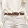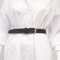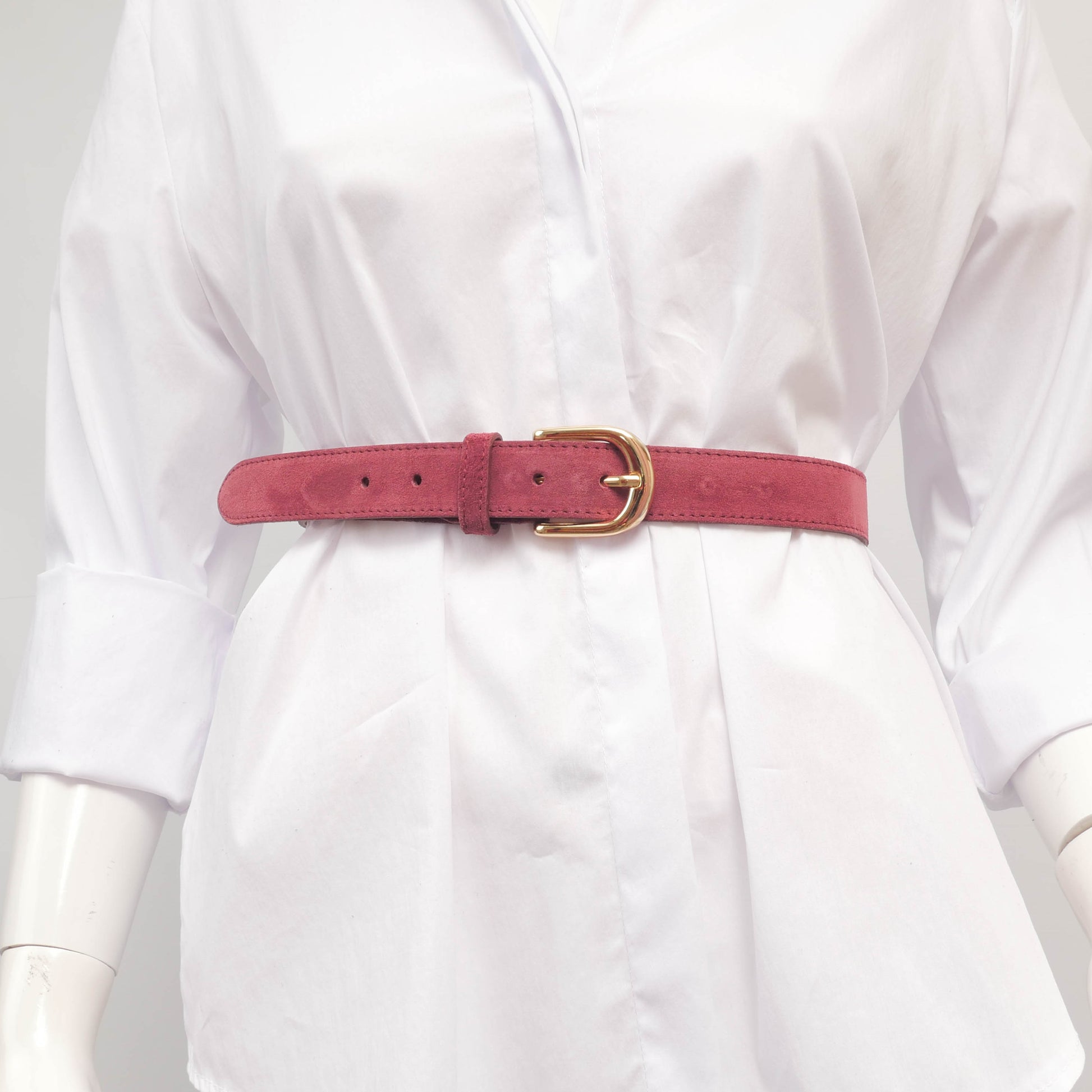 Cette ceinture en cuir daim de 2,8 cm de largeur séduit par sa simplicité raffinée et sa boucle arrondie dorée, qui lui confèrent une touche de féminité intemporelle. Son cuir velouté offre une texture subtile et un fini mat qui s’harmonise facilement avec toutes vos tenues.