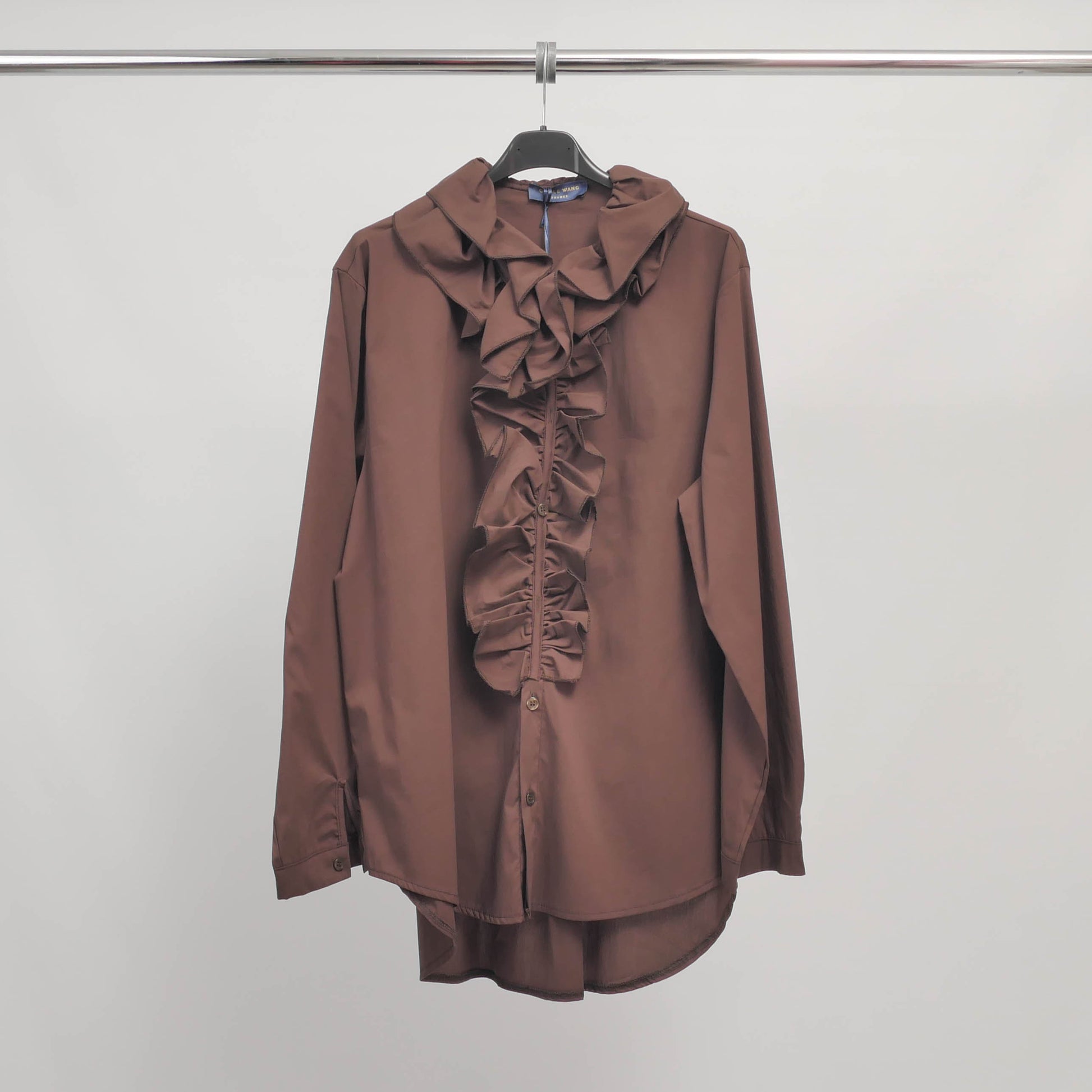 Un classique revisité avec une touche romantique. Cette chemise ample se distingue par un plastron orné de volants généreux qui encadrent élégamment la patte de boutonnage et se prolongent autour du col. Confectionnée dans un mélange de coton stretch, elle allie confort, structure et fluidité. Sa coupe légèrement plus longue à l’arrière permet un porter moderne, aussi bien rentrée que loose.