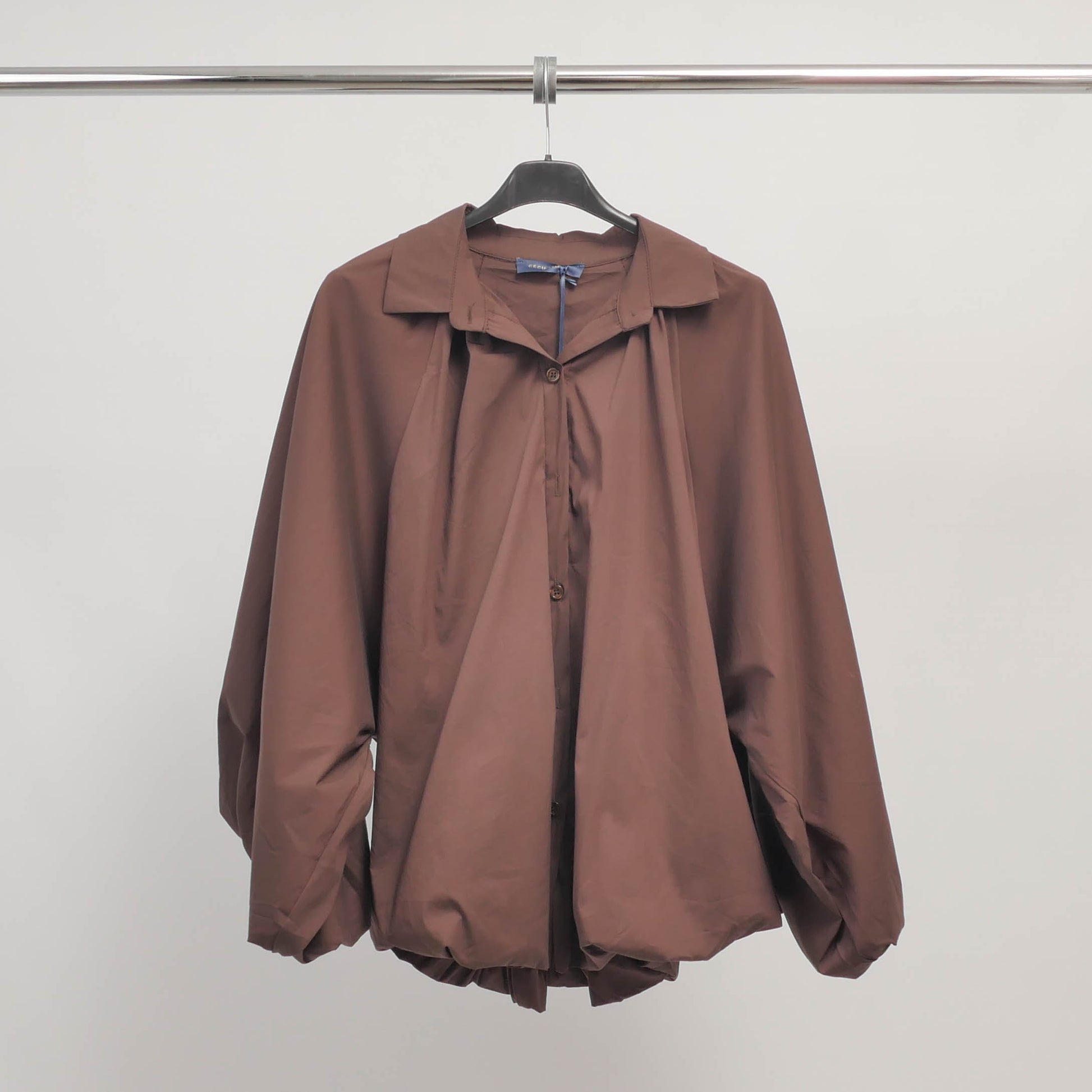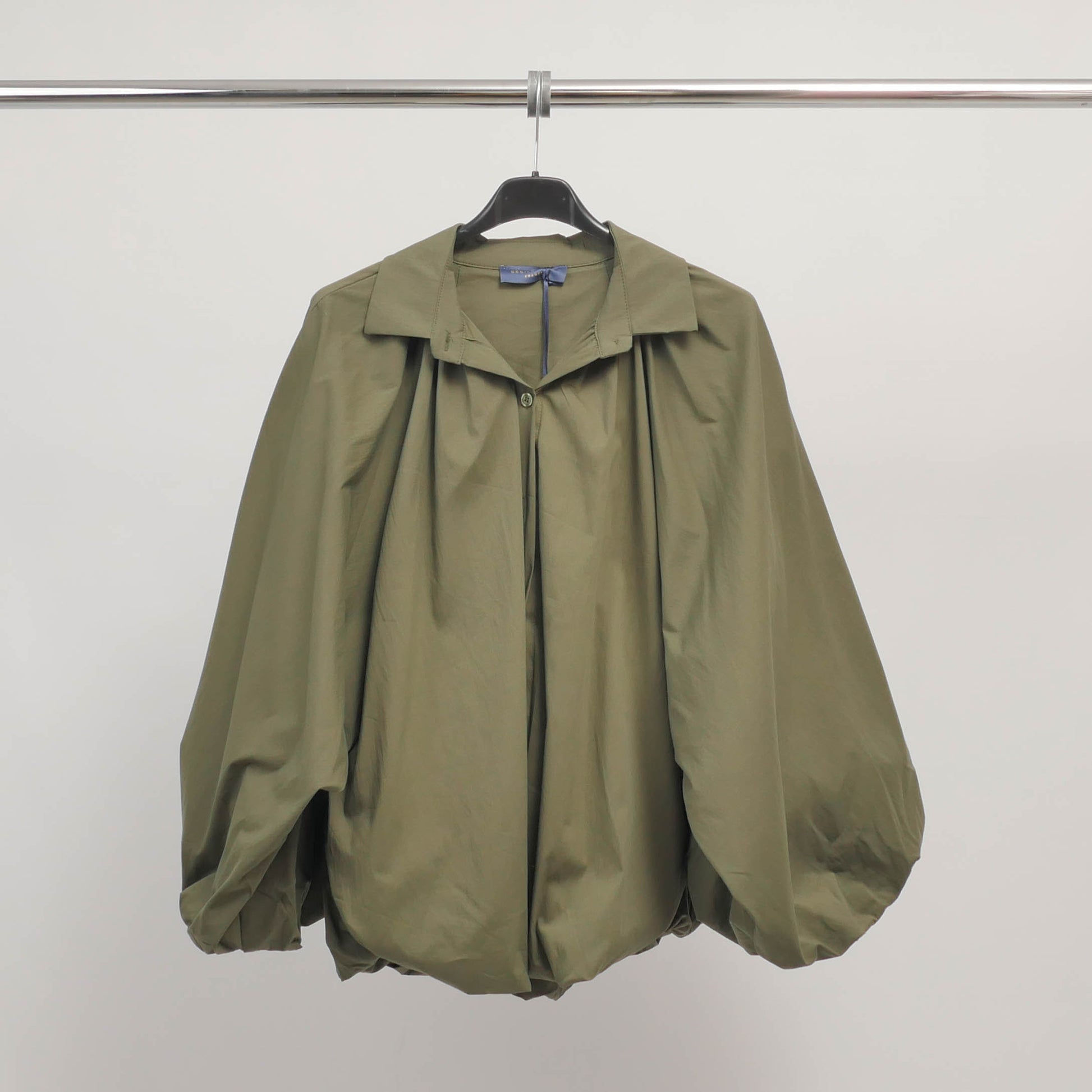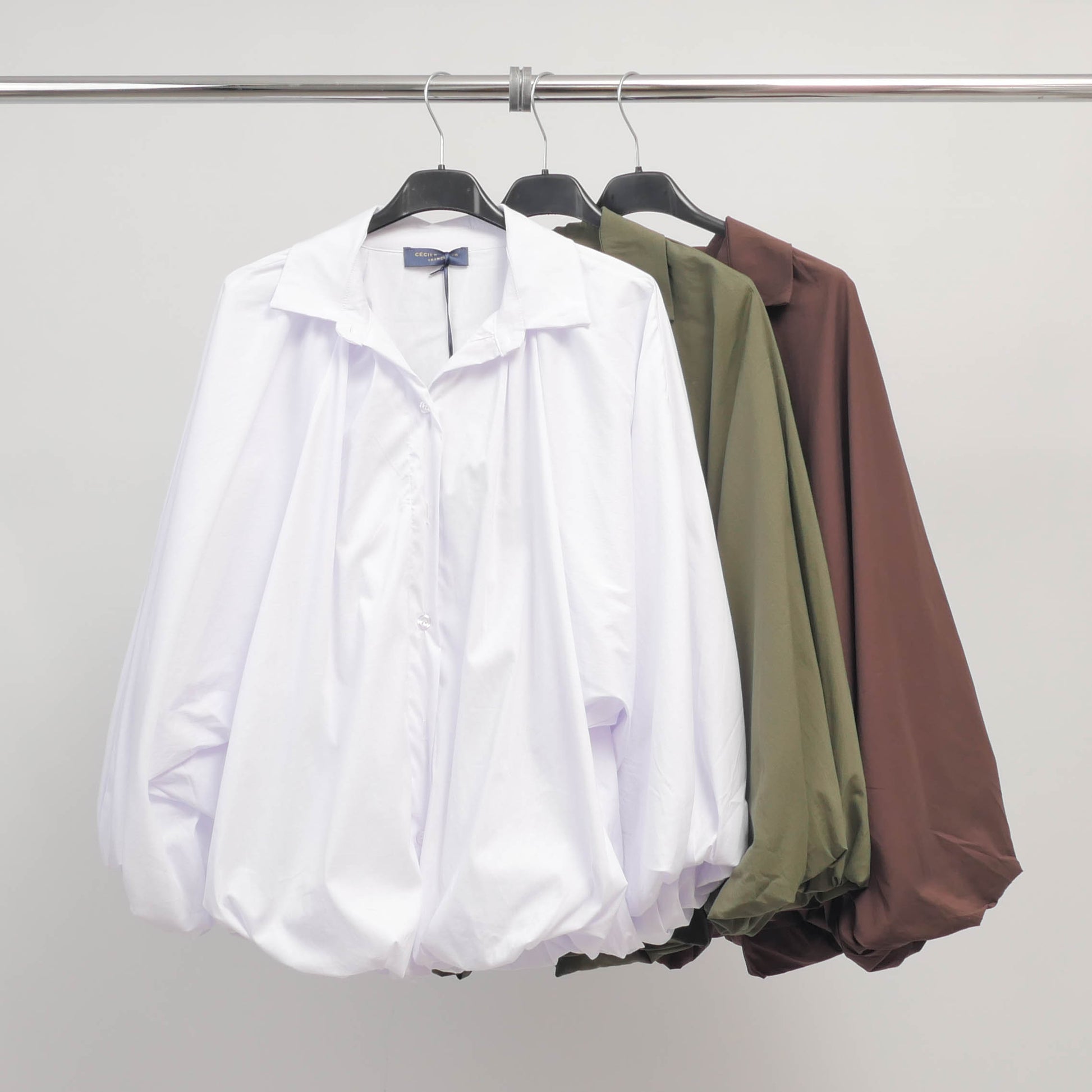 Cette chemise oversize séduit par sa coupe ample et fluide, sublimée par des manches ballon spectaculaires et un ourlet resserré qui structure la silhouette. Le col classique et la fermeture boutonnée à l’avant conservent une touche d’élégance intemporelle, tandis que le tissu légèrement technique apporte légèreté et maintien.