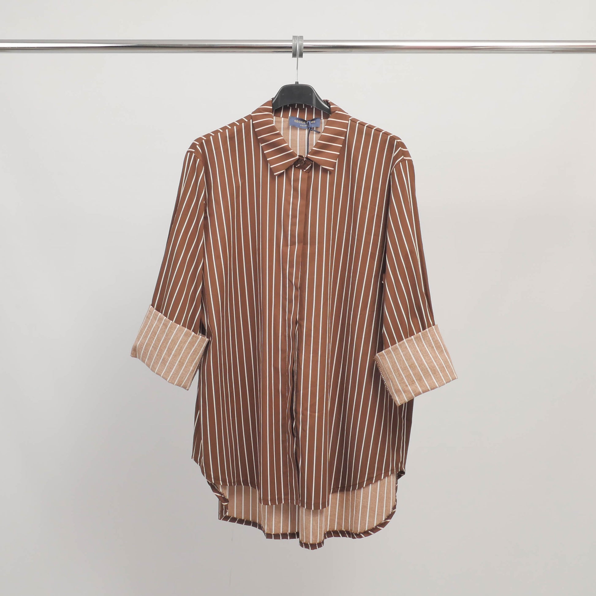 Un jeu graphique de rayures pour un style à la fois chic et décontracté. Cette chemise ample se distingue par ses lignes verticales qui allongent la silhouette et ses poignets contrastés à revers pour une touche moderne et élégante. Sa coupe fluide et légèrement plus longue à l’arrière offre confort et liberté de mouvement, tout en gardant une allure soignée. Facile à associer, elle se porte aussi bien ouverte sur un top basique pour un look casual que rentrée dans un pantalon taille haute pour un rendu plus habillé.