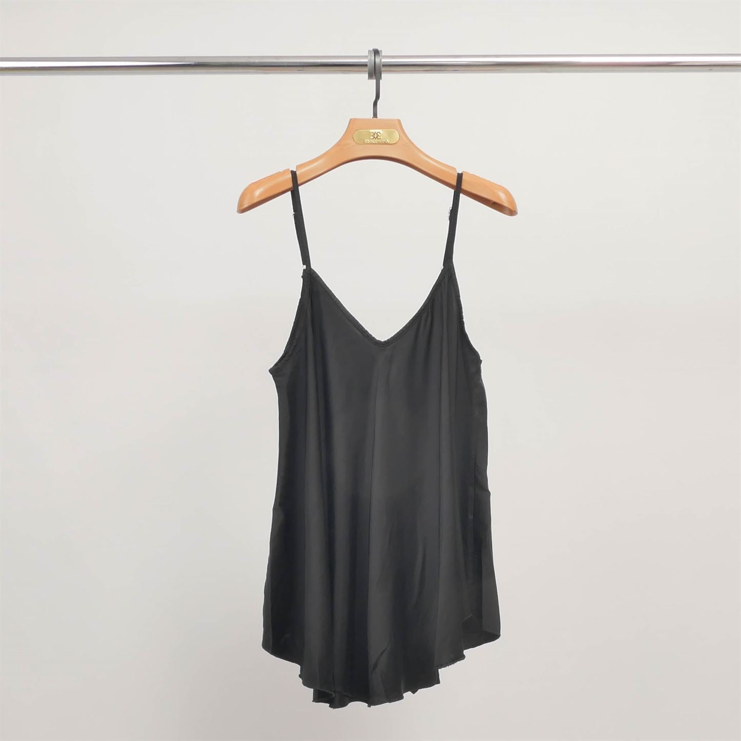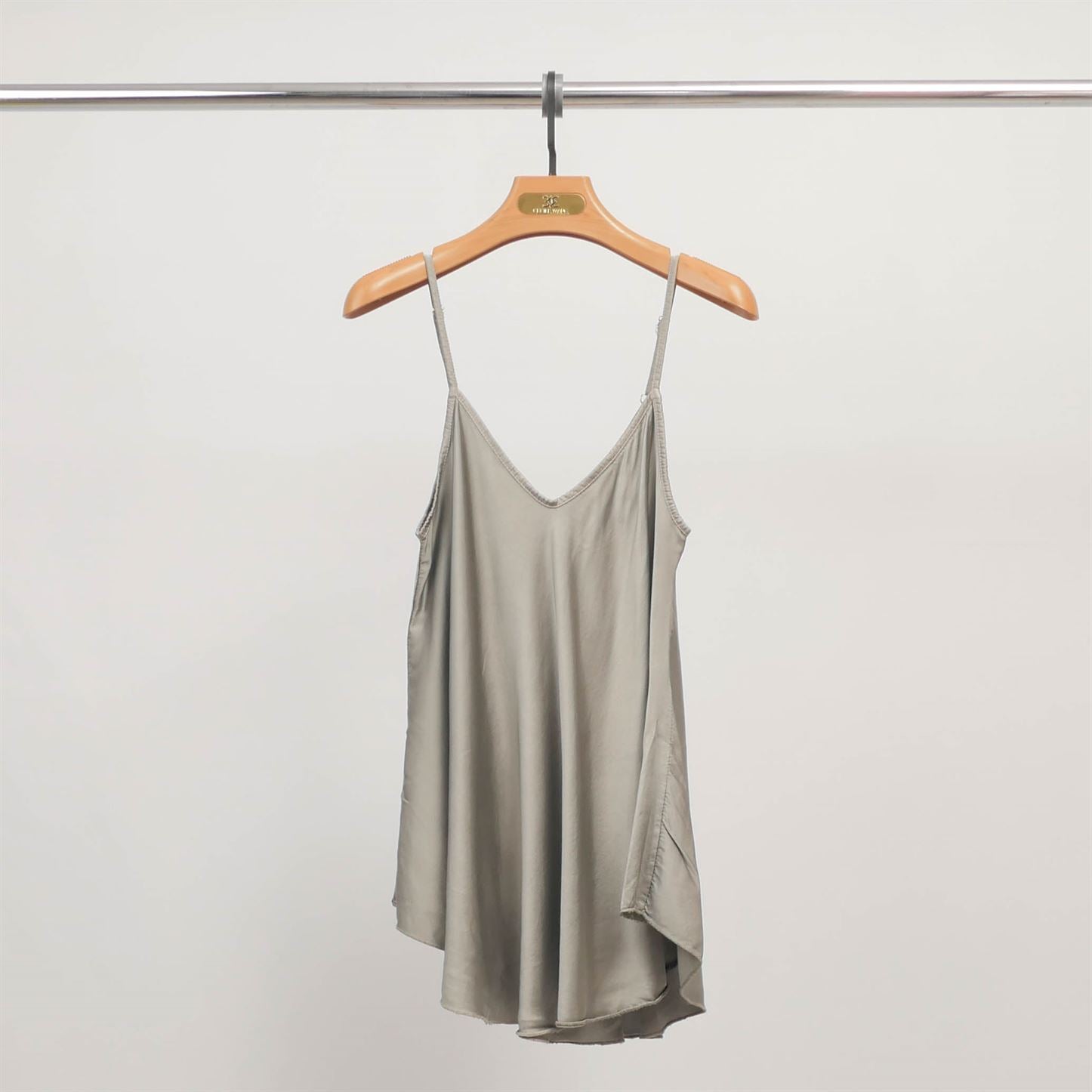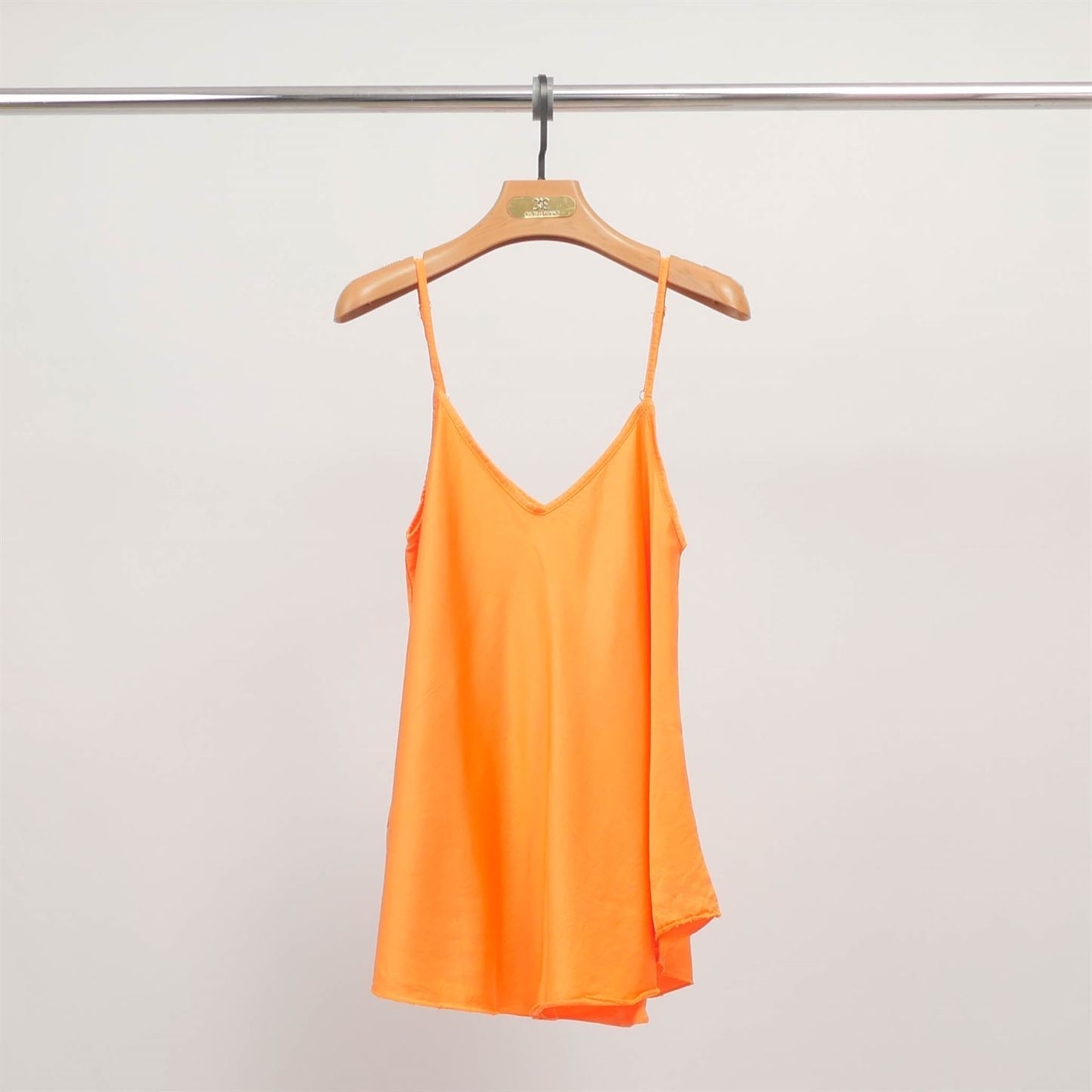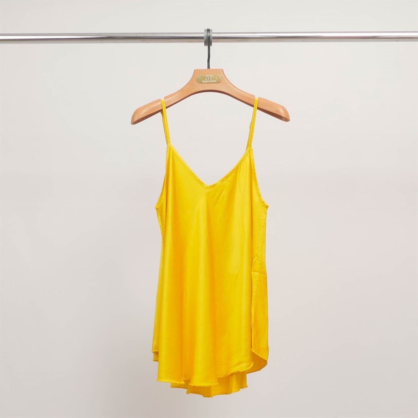 Ce débardeur se distingue par sa coupe fluide légèrement évasée, son encolure en V délicate et ses fines bretelles qui dévoilent subtilement les épaules. Sa texture douce et soyeuse lui confère un tombé élégant, parfait pour un style à la fois simple et raffiné.