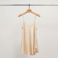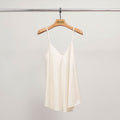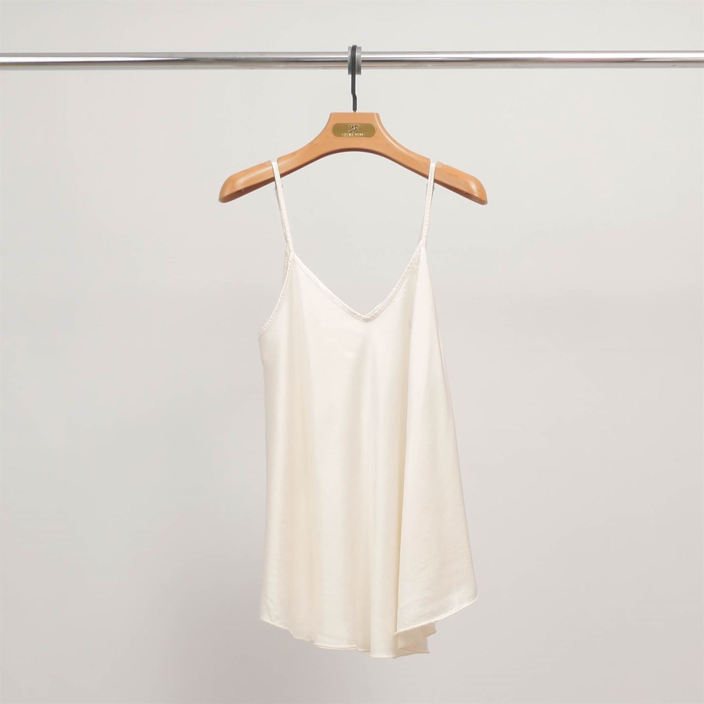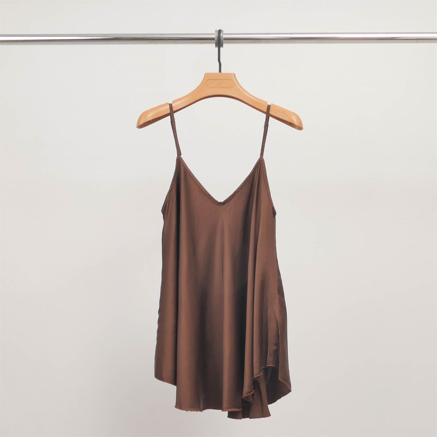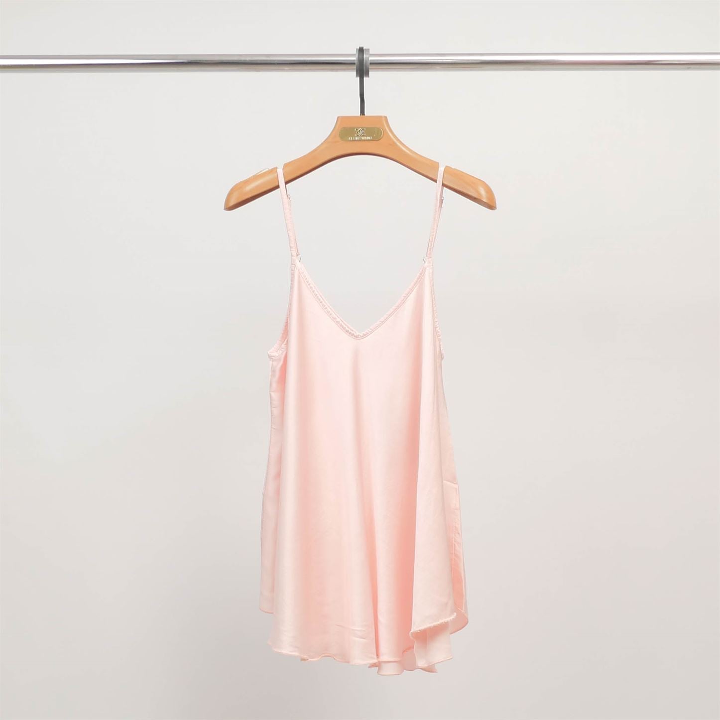 Ce débardeur se distingue par sa coupe fluide légèrement évasée, son encolure en V délicate et ses fines bretelles qui dévoilent subtilement les épaules. Sa texture douce et soyeuse lui confère un tombé élégant, parfait pour un style à la fois simple et raffiné.