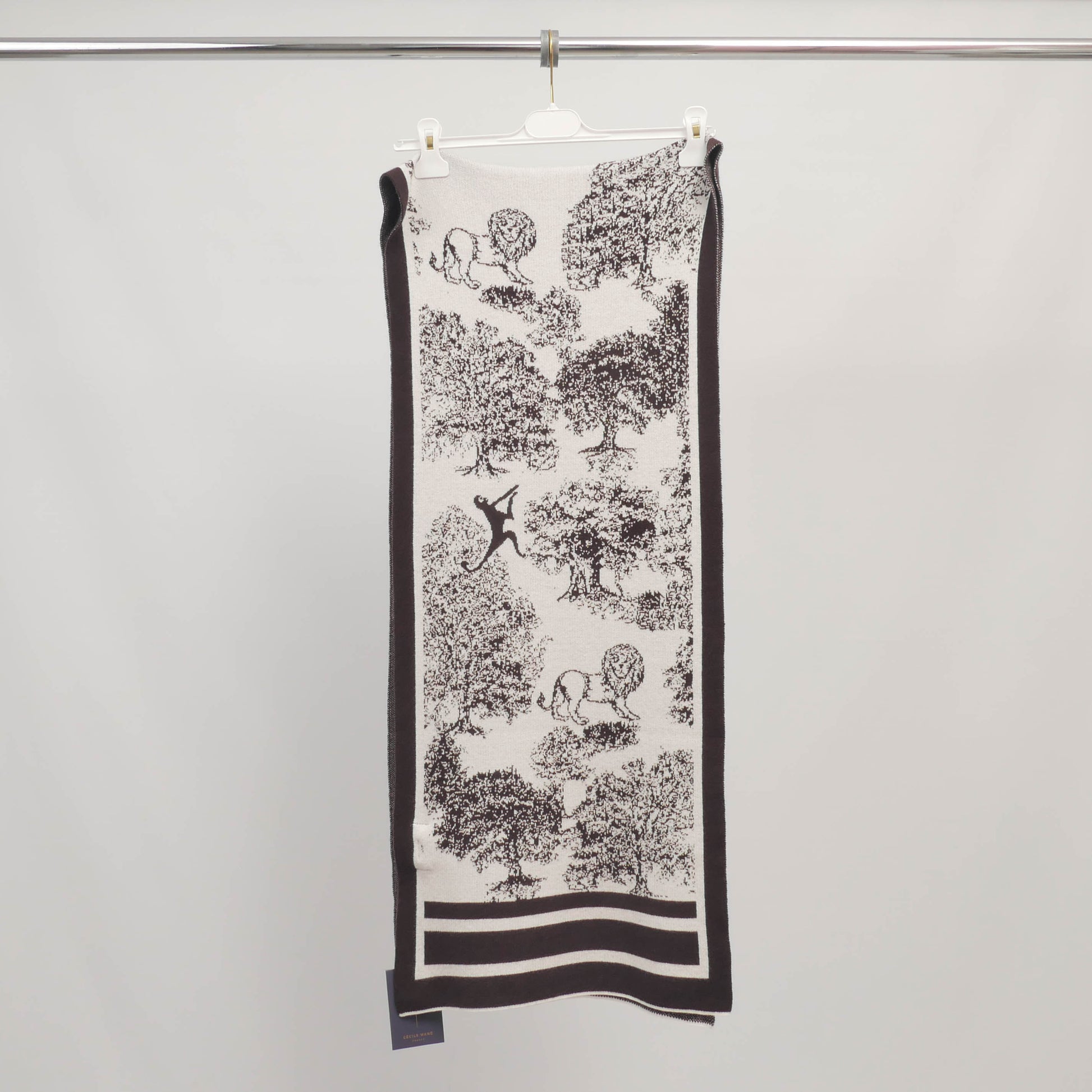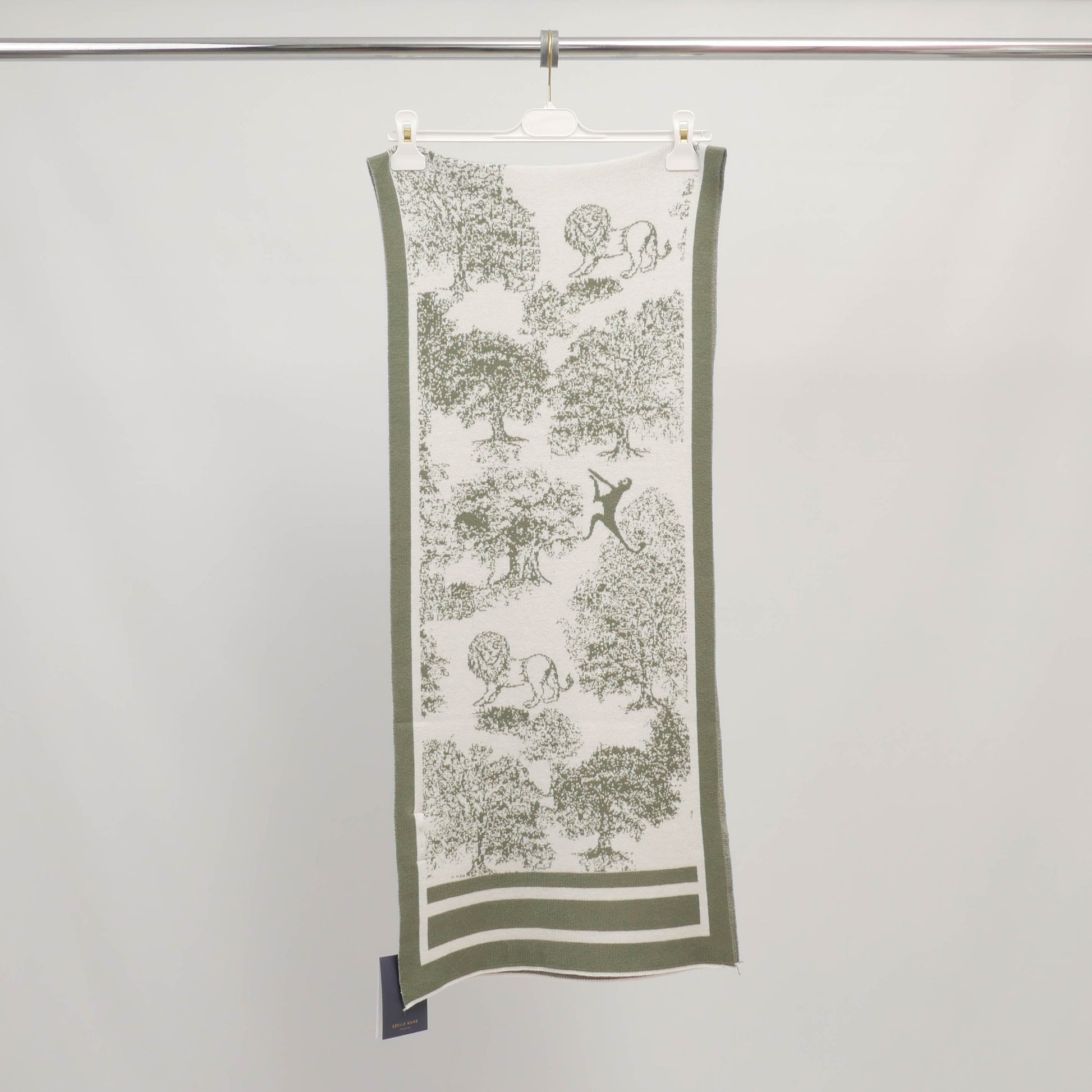 Un vent de poésie souffle sur votre garde-robe avec cette écharpe en maille au motif forêt délicatement travaillé. Son jacquard finement dessiné met en scène une nature onirique peuplée de lions majestueux et de silhouettes dansantes, pour une pièce à la fois graphique et élégante.