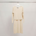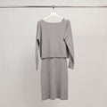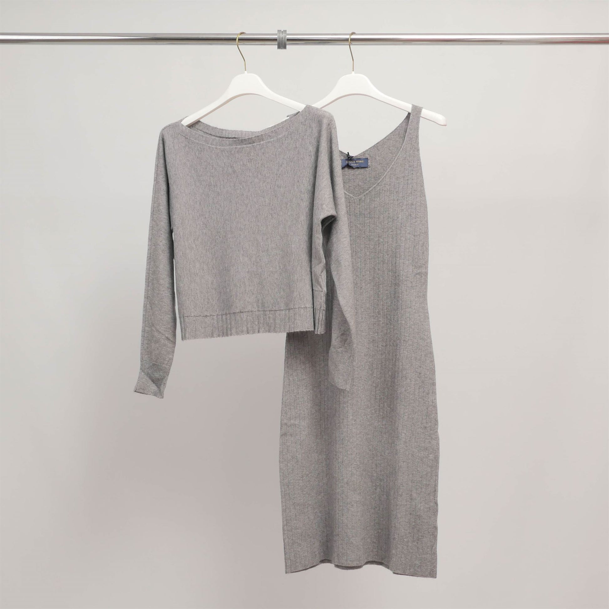 Composé d’une robe débardeur côtelée à encolure en V et d’un pull oversize à col bateau, cet ensemble se superpose avec fluidité pour créer un look à la fois cosy et raffiné. Les manches longues tombantes du pull apportent une touche décontractée, tandis que la robe souligne naturellement la silhouette sans la contraindre.