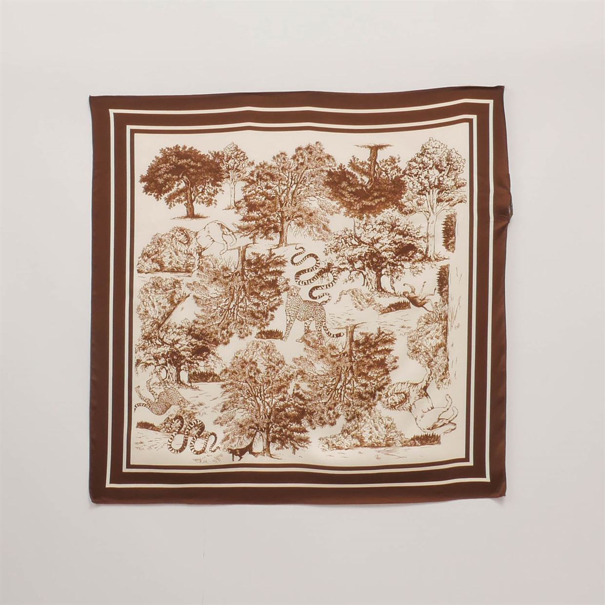 Ajoutez une touche d’élégance sauvage à vos tenues avec ce foulard carré au motif jungle raffiné. Son imprimé inspiré de la faune exotique se décline dans des teintes profondes, sublimé par un contour à rayures contrastées pour un effet graphique chic.