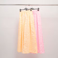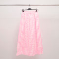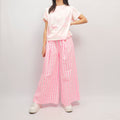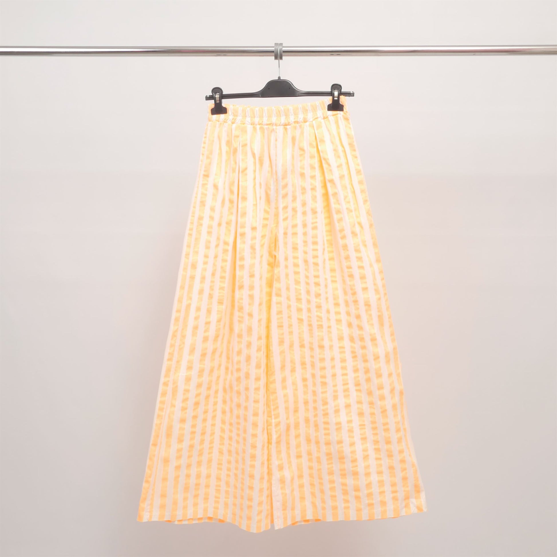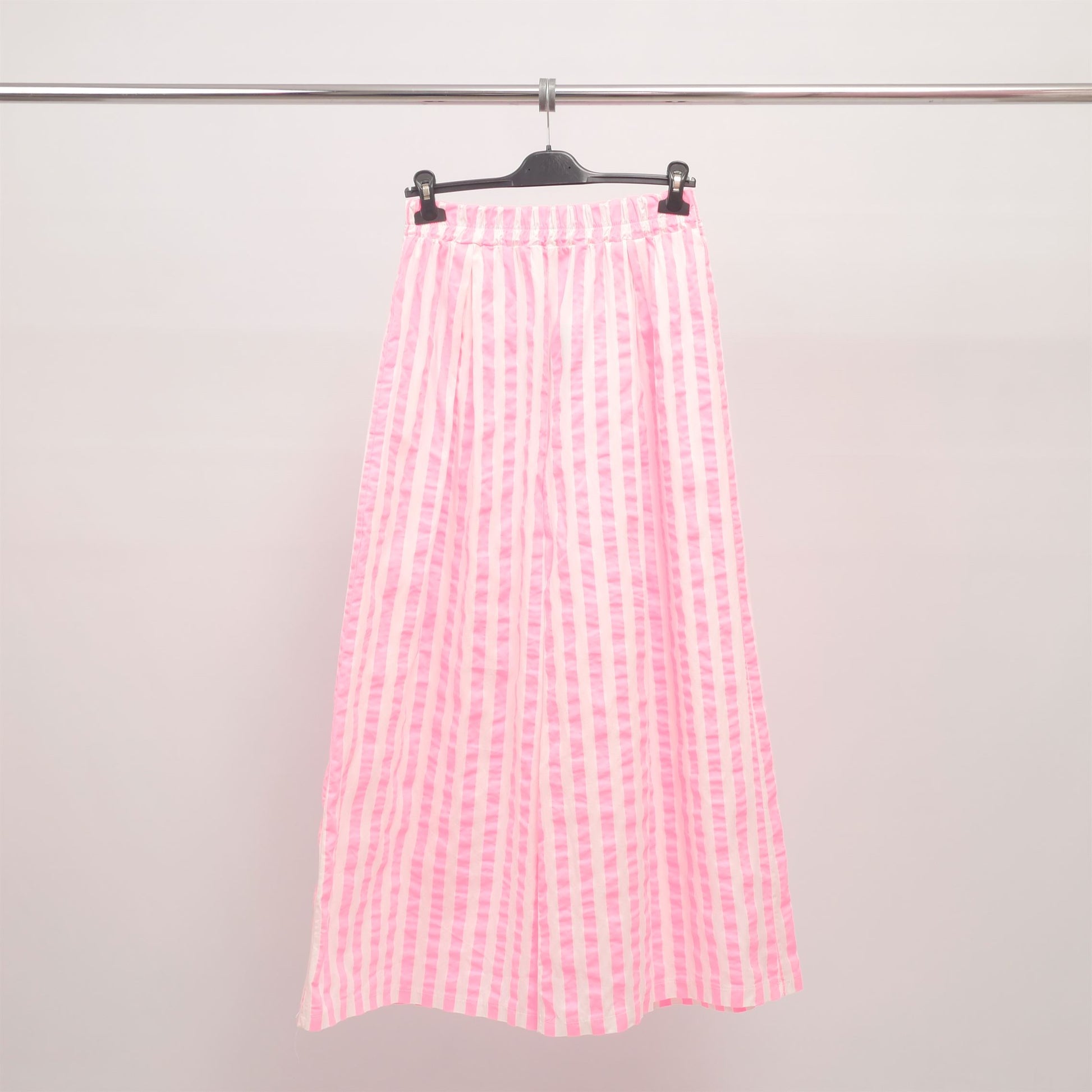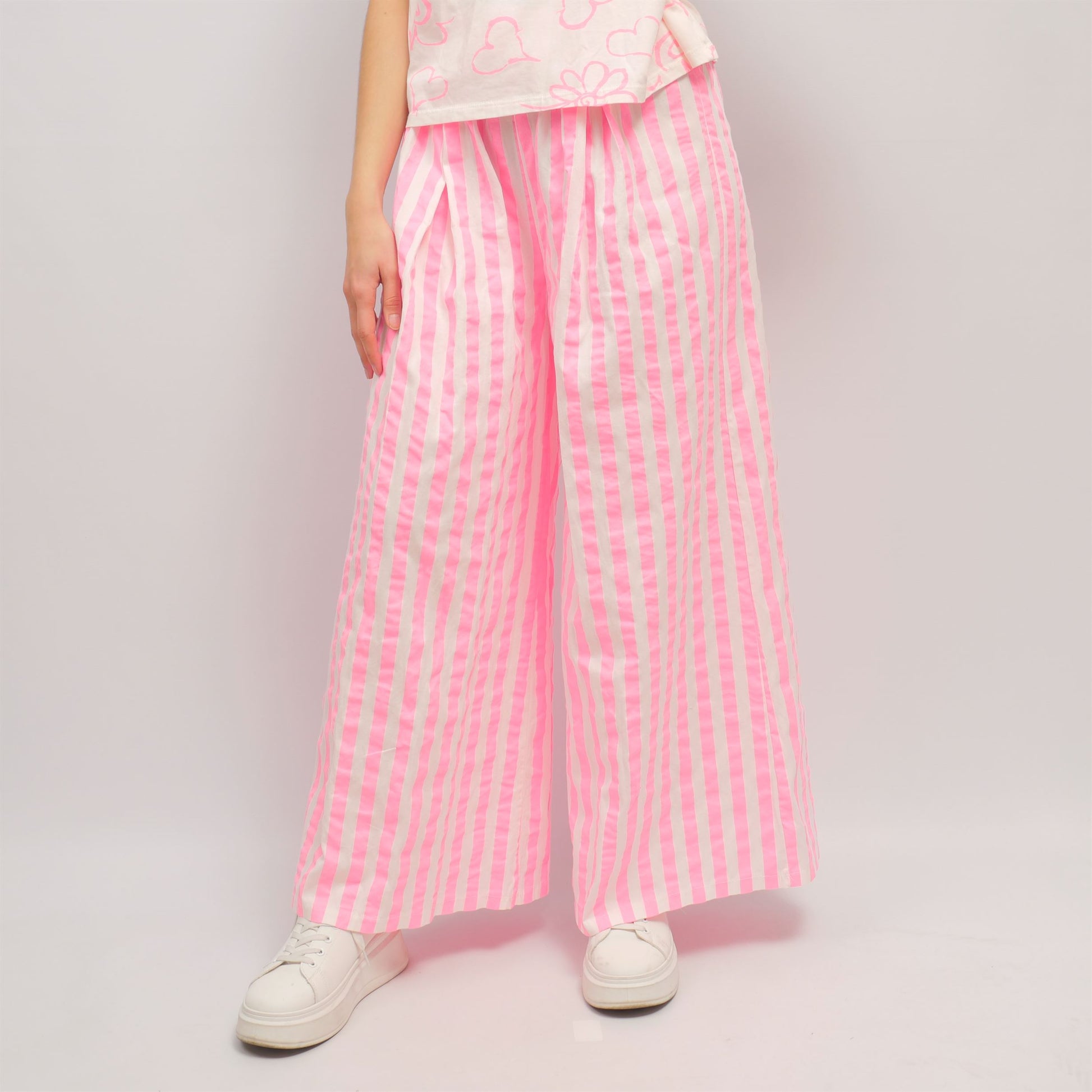 Un esprit estival souffle sur ce pantalon à rayures verticales texturées, disponible en orange lumineux ou rose vif.