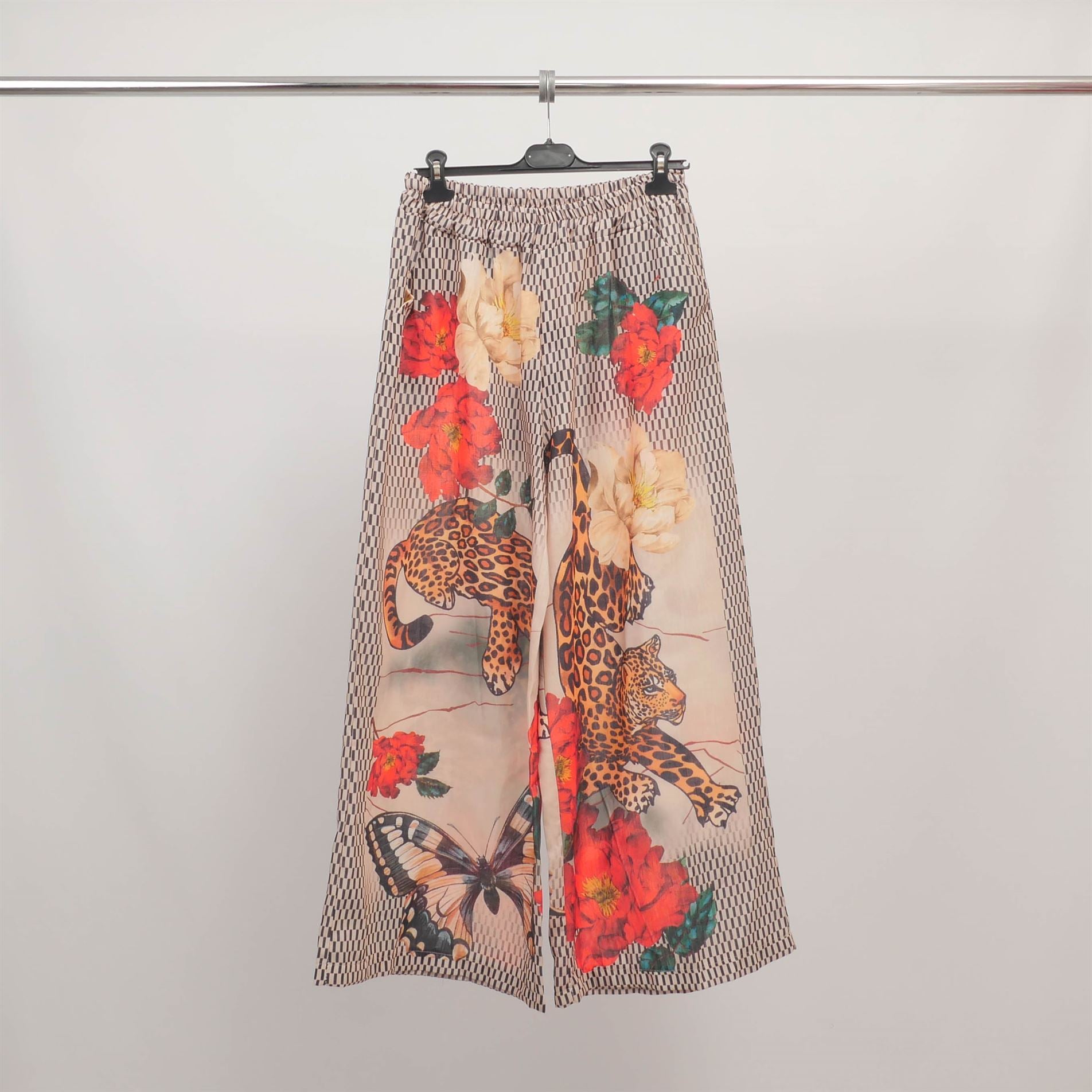 Ce pantalon large séduit par ses imprimés éclectiques et hauts en couleur, entre esprit Riviera, bestiaire exotique et clins d’œil arty. Sa coupe fluide et aérienne, associée à une taille élastiquée confortable, en fait une pièce facile à porter au quotidien comme en vacances.