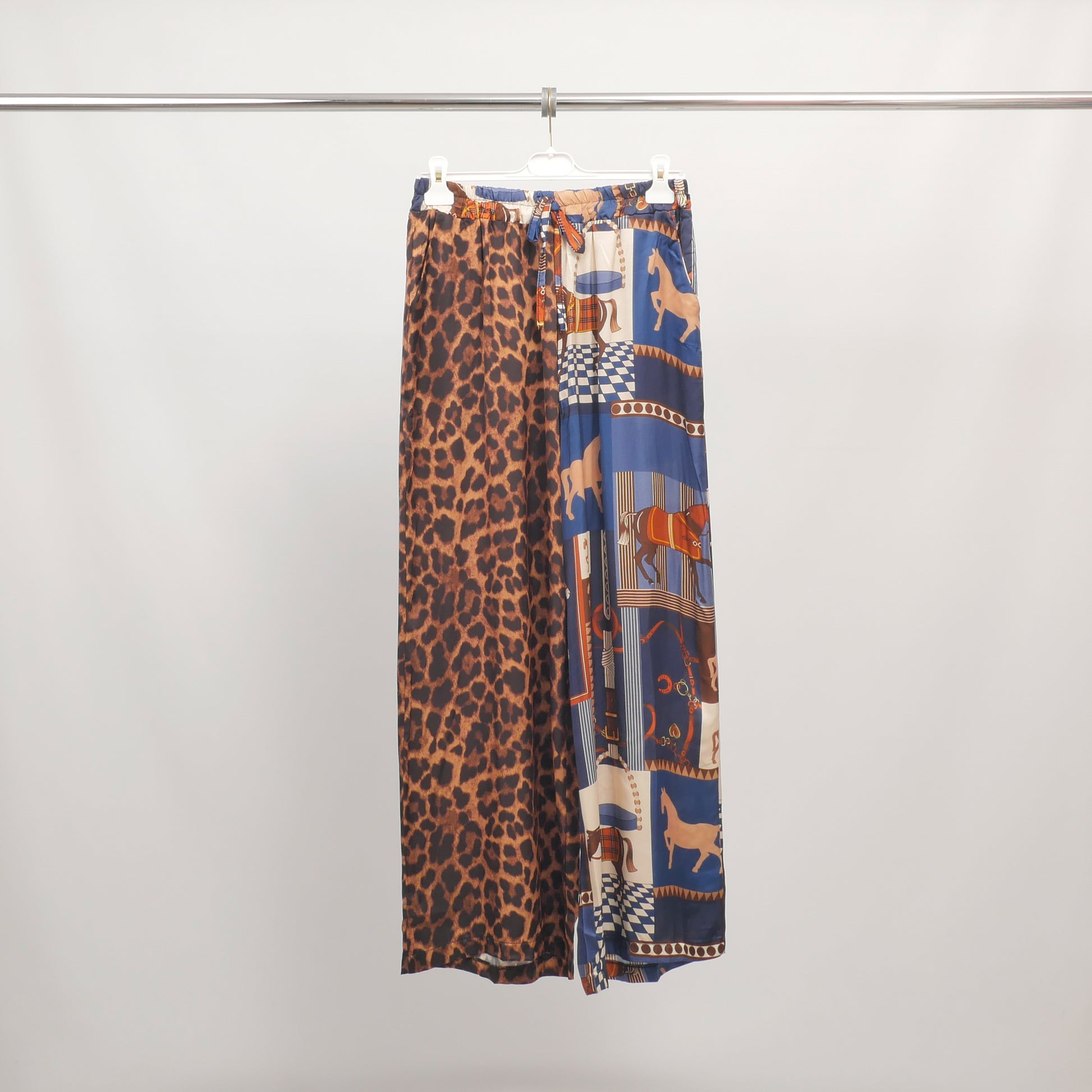 Ce pantalon fluide se distingue par son audacieux contraste de motifs : un pan léopard sauvage, l’autre orné d’imprimés équestres aux accents vintage. Sa coupe ample et légère accompagne les mouvements avec élégance, tandis que la taille élastiquée avec lien de serrage assure un confort optimal tout au long de la journée.