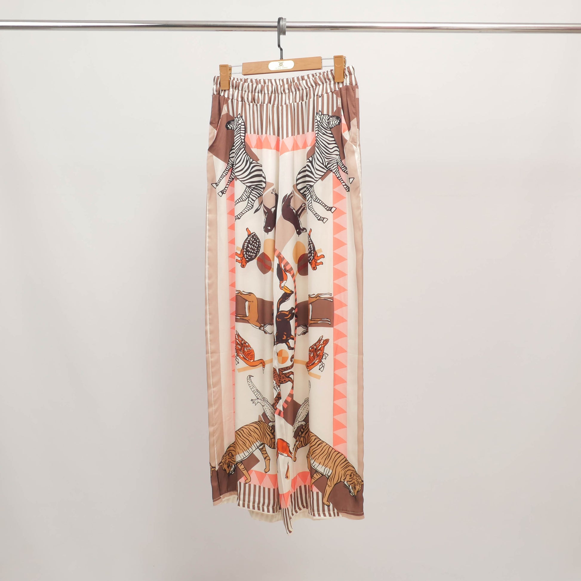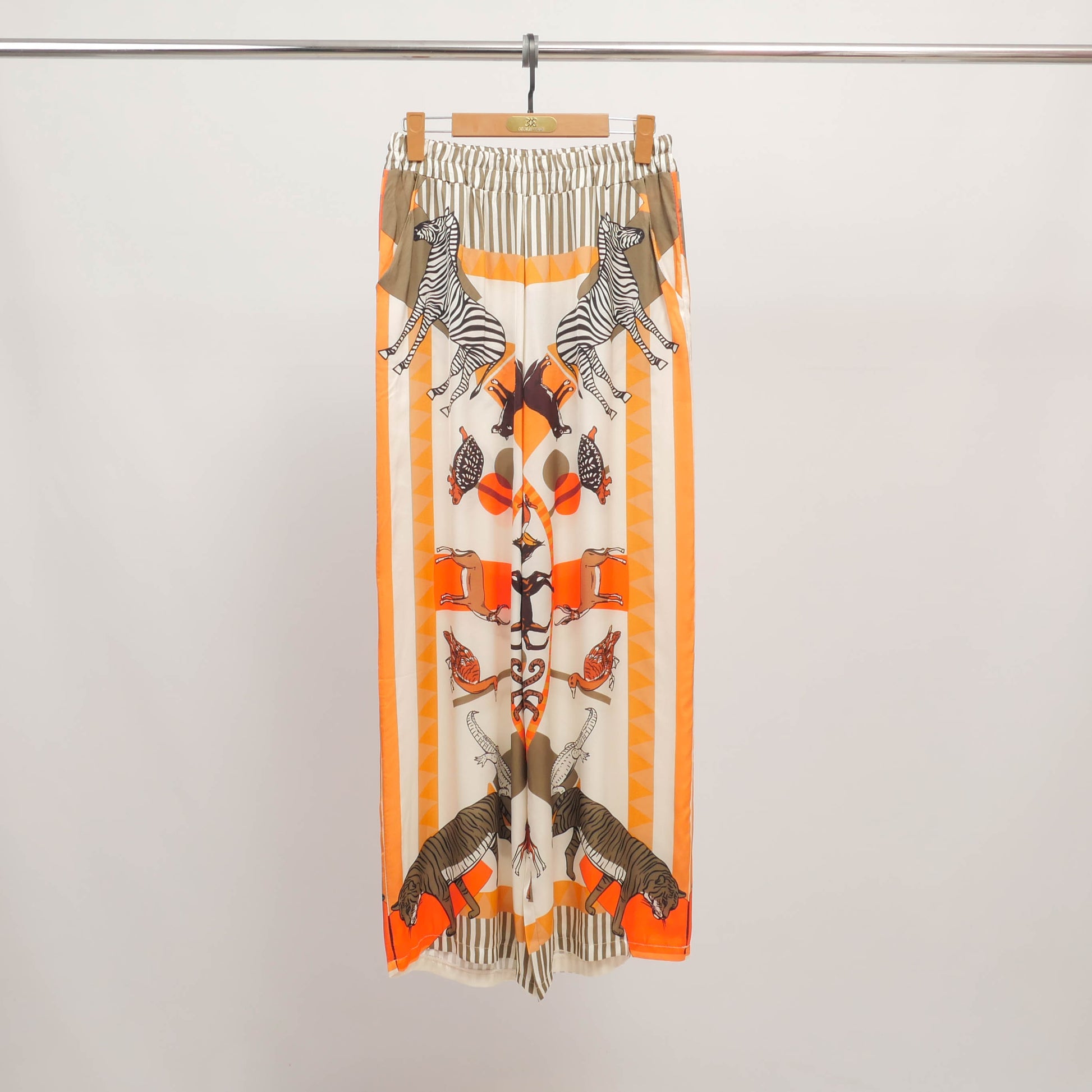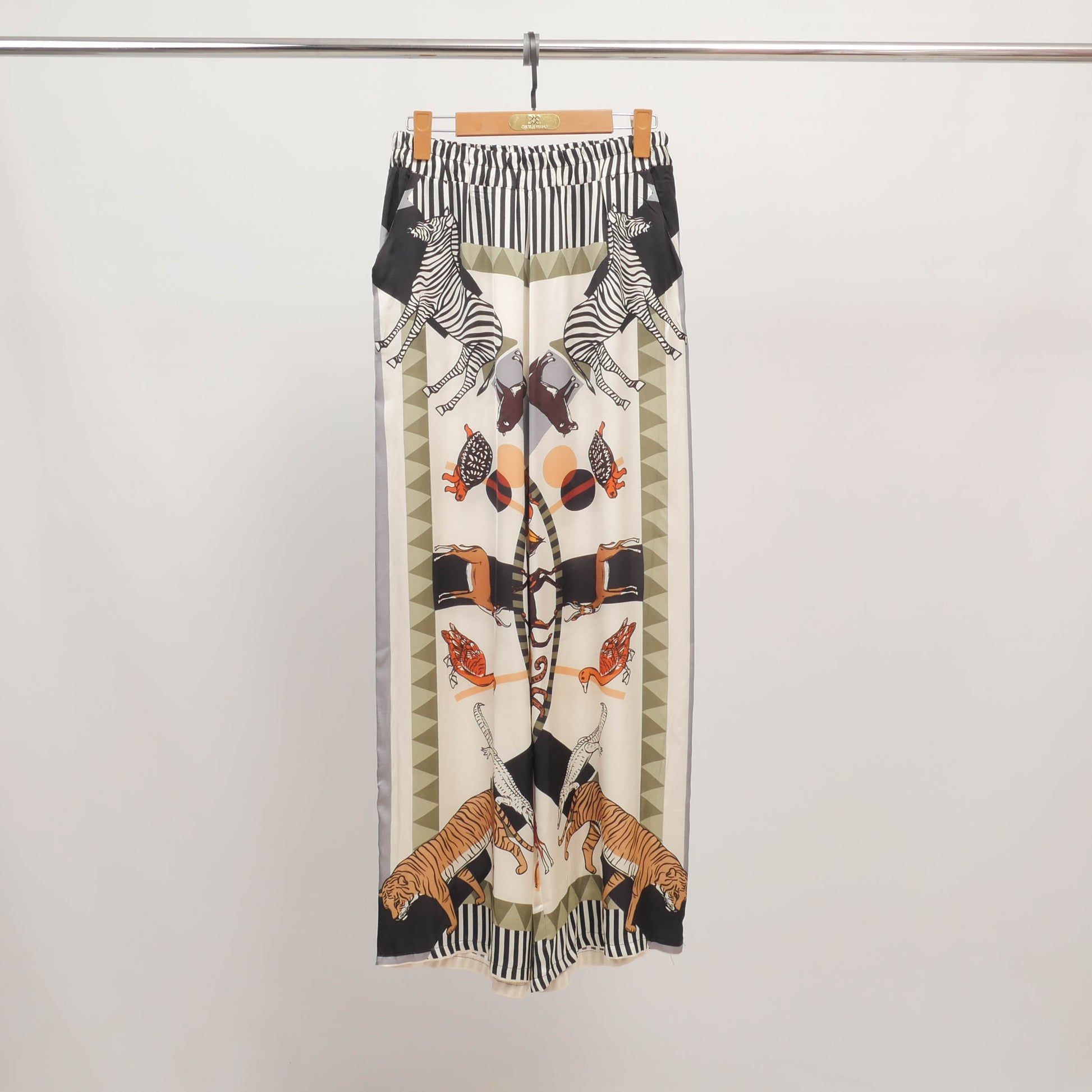 Une invitation au voyage et à l’évasion sauvage. Ce pantalon fluide séduit par son imprimé spectaculaire mettant en scène zèbres, tigres et oiseaux exotiques dans une composition graphique et symétrique. Taille haute élastiquée, coupe large et tombé aérien assurent un confort optimal et une allure élégante en mouvement. Son motif travaillé et ses finitions rayées à la taille et aux chevilles en font une pièce forte à associer à un haut uni ou à la blouse coordonnée pour un total look assumé.