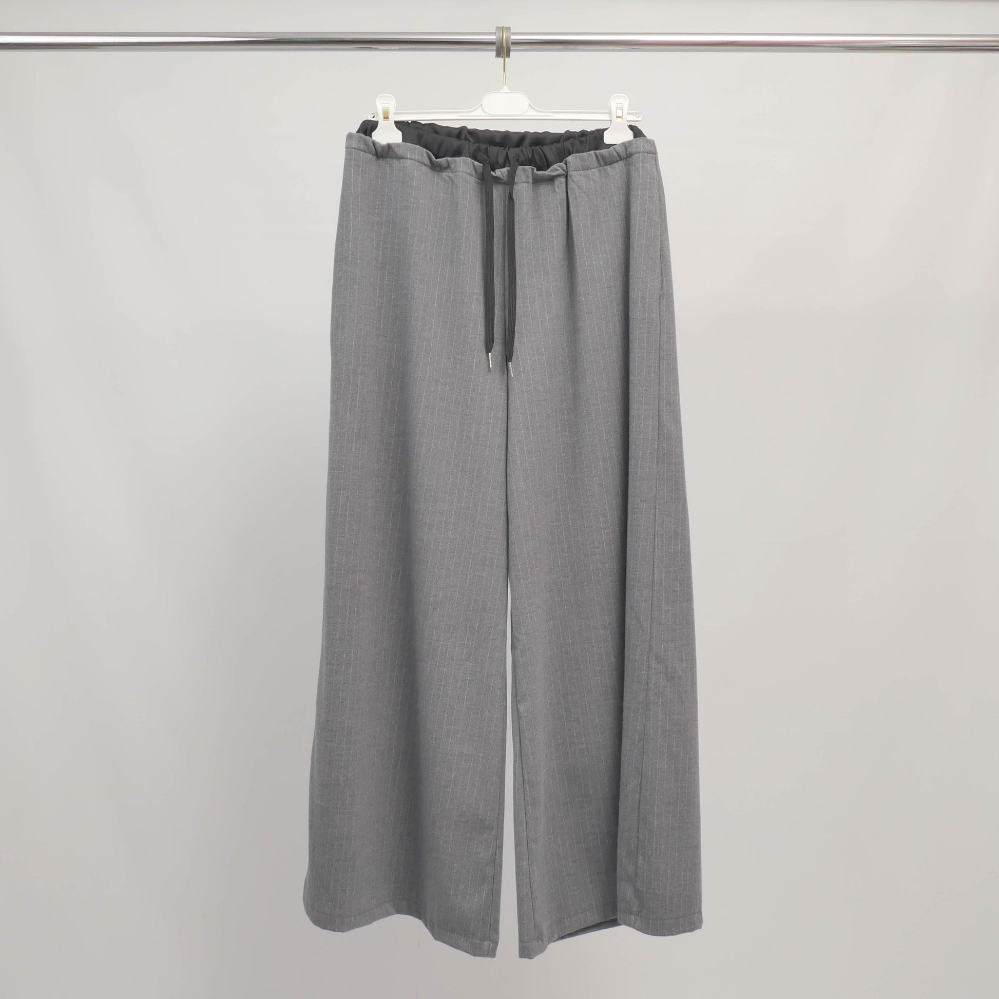 La taille élastiquée avec lien de serrage apporte une touche décontractée et permet un ajustement parfait, tandis que le tissu à fines rayures ton sur ton évoque discrètement l’univers tailleur. Un équilibre parfait entre décontraction et sophistication.
