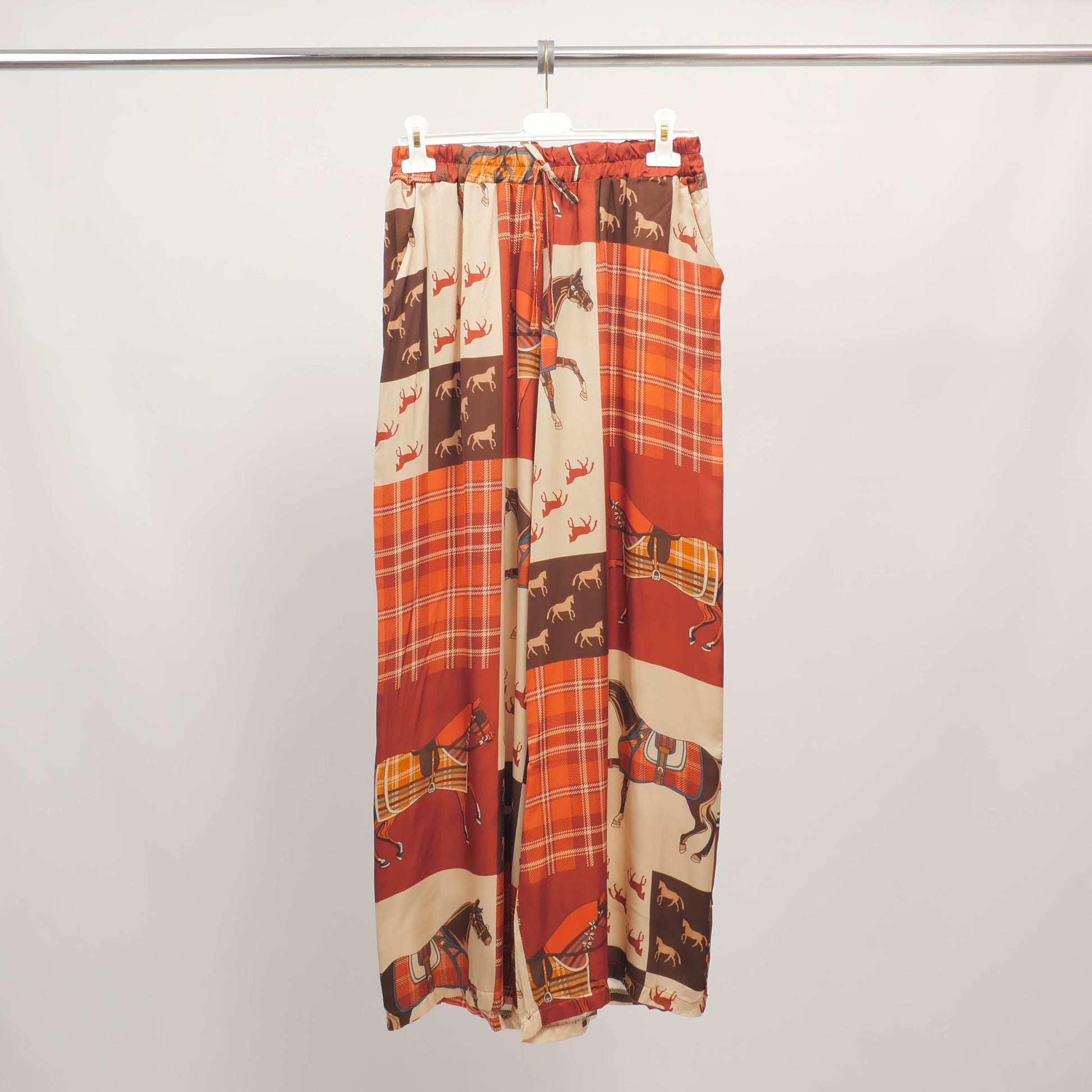Ce modèle fluide séduit par son imprimé équestre aux accents vintage, mêlant motifs de chevaux sellés et carreaux écossais dans un patchwork élégant. La taille élastiquée avec lien de serrage assure un ajustement parfait tout au long de la journée, tandis que la coupe ample apporte une belle liberté de mouvement.