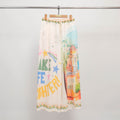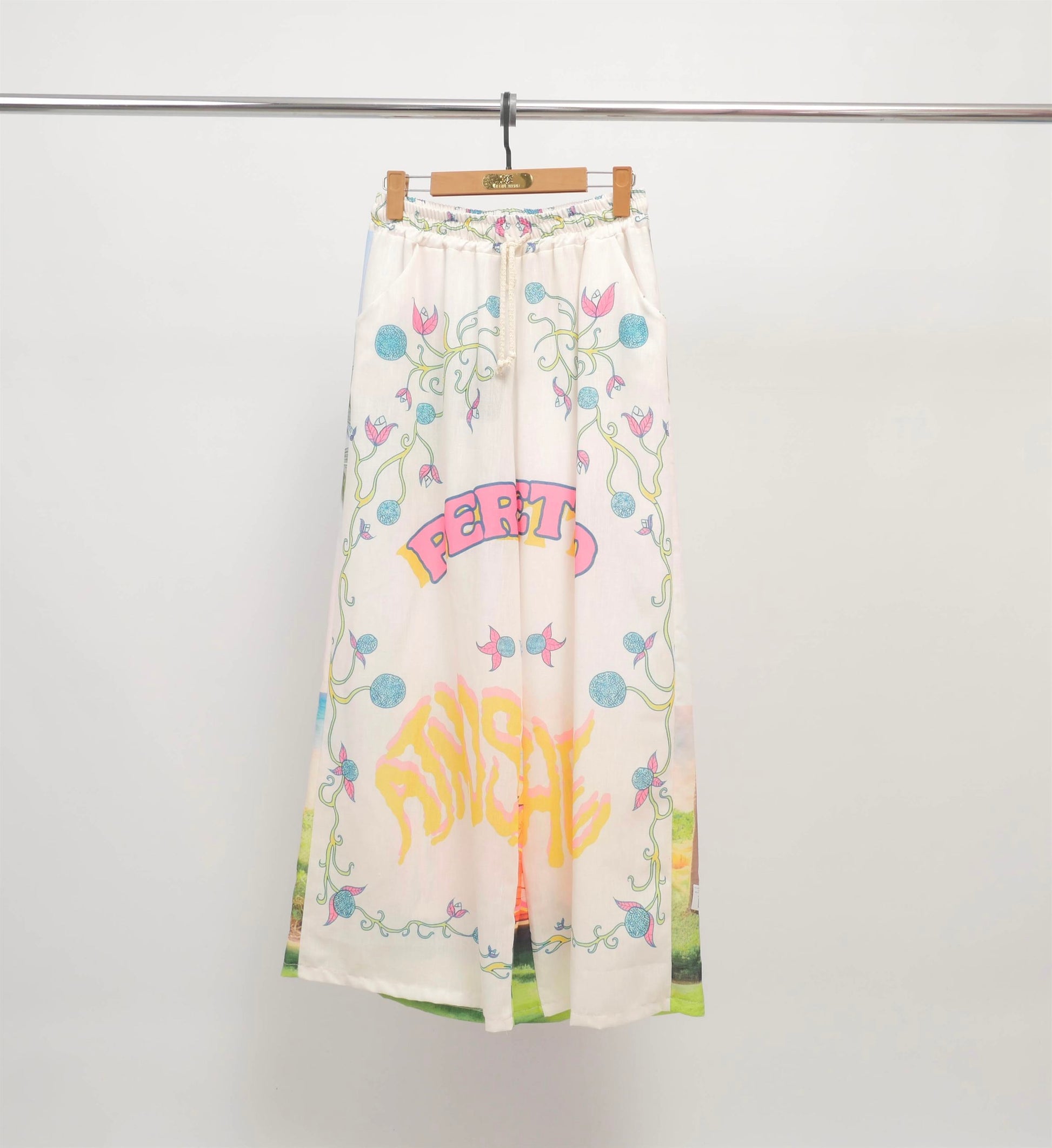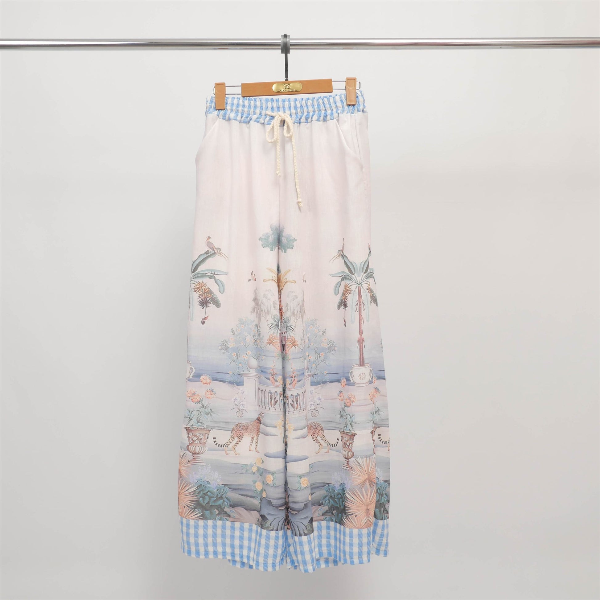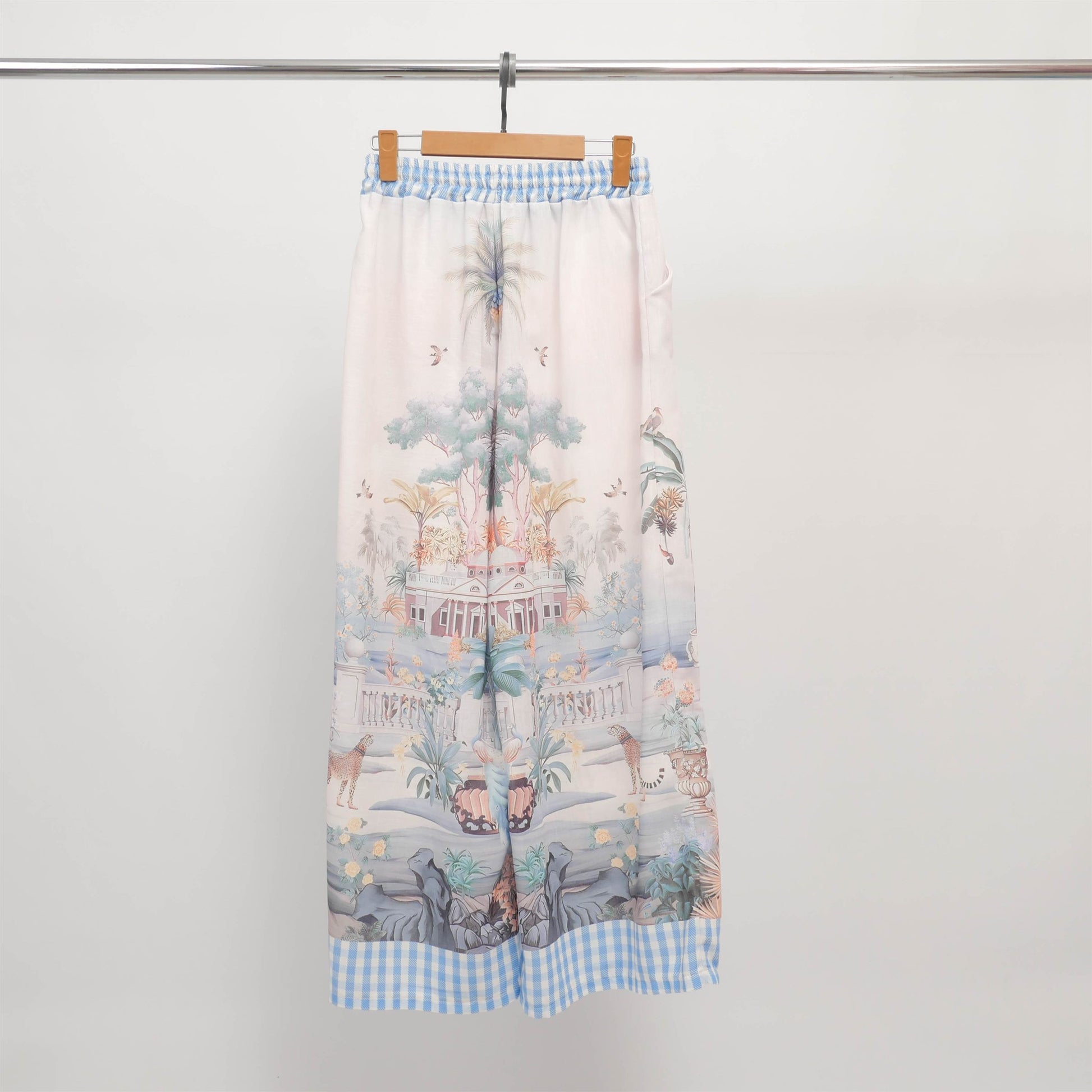 Invitation à l’évasion avec ce pantalon fluide orné d’un somptueux imprimé de paysages exotiques. Sa coupe ample et sa taille élastiquée avec lien de serrage offrent un confort absolu tout en sublimant la silhouette avec légèreté. Les motifs panoramiques, rehaussés d’une finition vichy en bas de jambe, apportent une touche artistique et estivale à votre tenue. À porter avec un top uni ou une chemise coordonnée pour un look de vacances raffiné, en ville comme au bord de la mer.