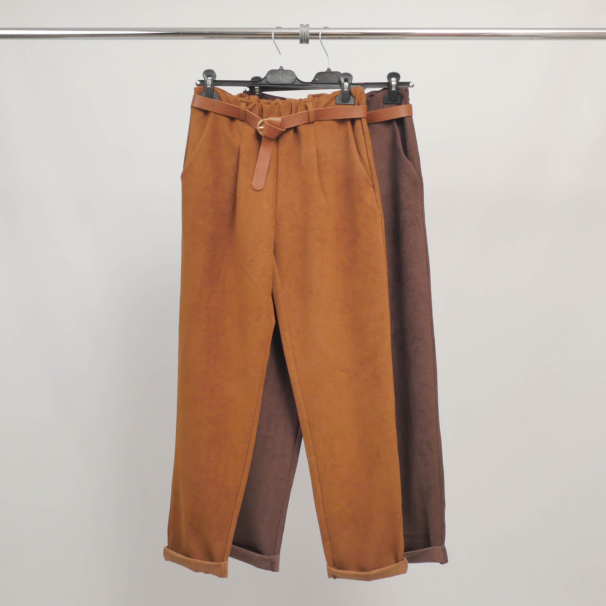 Ce pantalon à taille haute adopte une coupe paperbag élégante, sublimée par une ceinture fine ton sur ton à boucle dorée. Sa matière effet velours apporte douceur et texture, tandis que sa coupe droite légèrement fuselée allonge la silhouette. Les pinces à l’avant et les poches latérales renforcent son style urbain-chic.