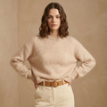 Ce modèle à col rond séduit par sa texture duveteuse et son tombé souple, qui en font une pièce aussi confortable que féminine. Les manches longues légèrement bouffantes apportent du volume, tandis que les finitions côtelées au col, aux poignets et à la base assurent un maintien subtil et une silhouette structurée.