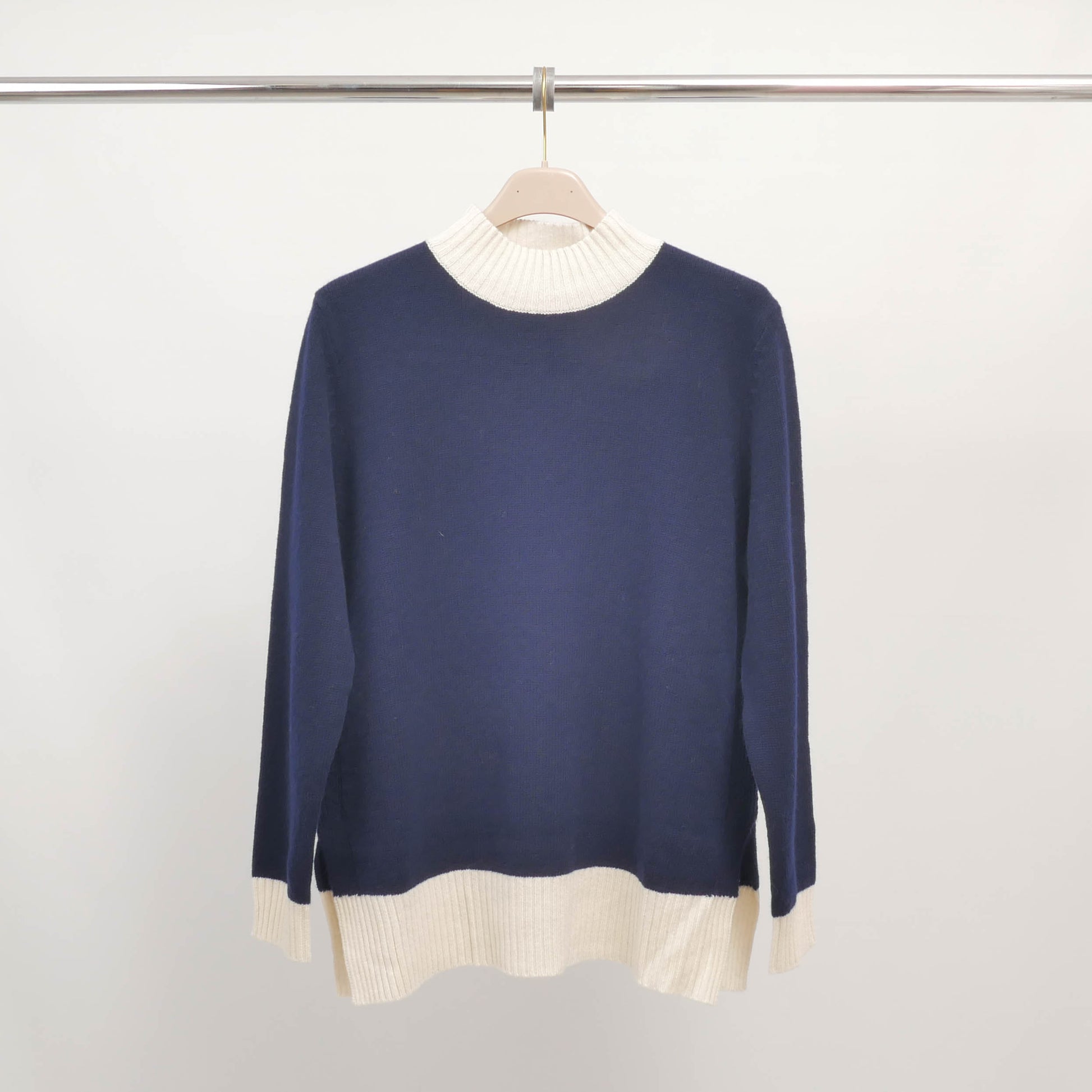 Ce pull en laine présente un col montant côtelé et des finitions en bord-côtes bicolores au col, à la base et aux poignets, pour une allure moderne et élégante. Sa coupe droite et ses fentes latérales apportent confort et aisance de mouvement tout en mettant en valeur la silhouette.
