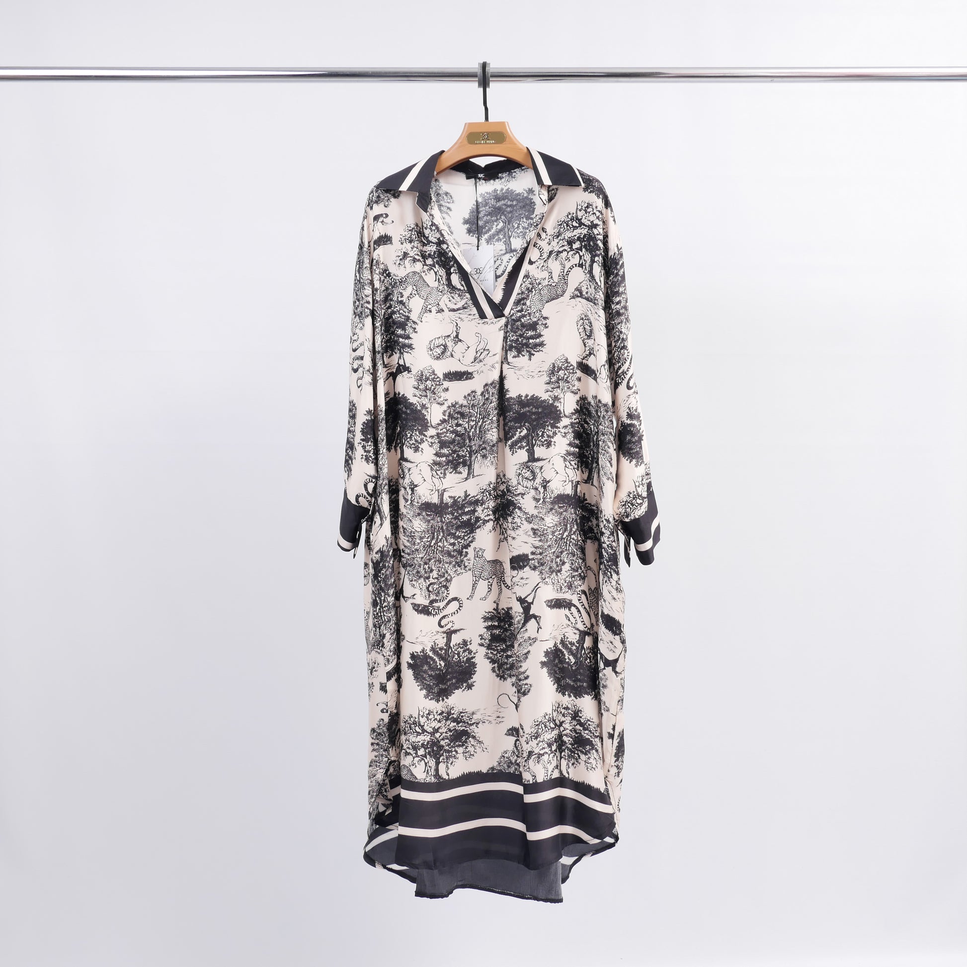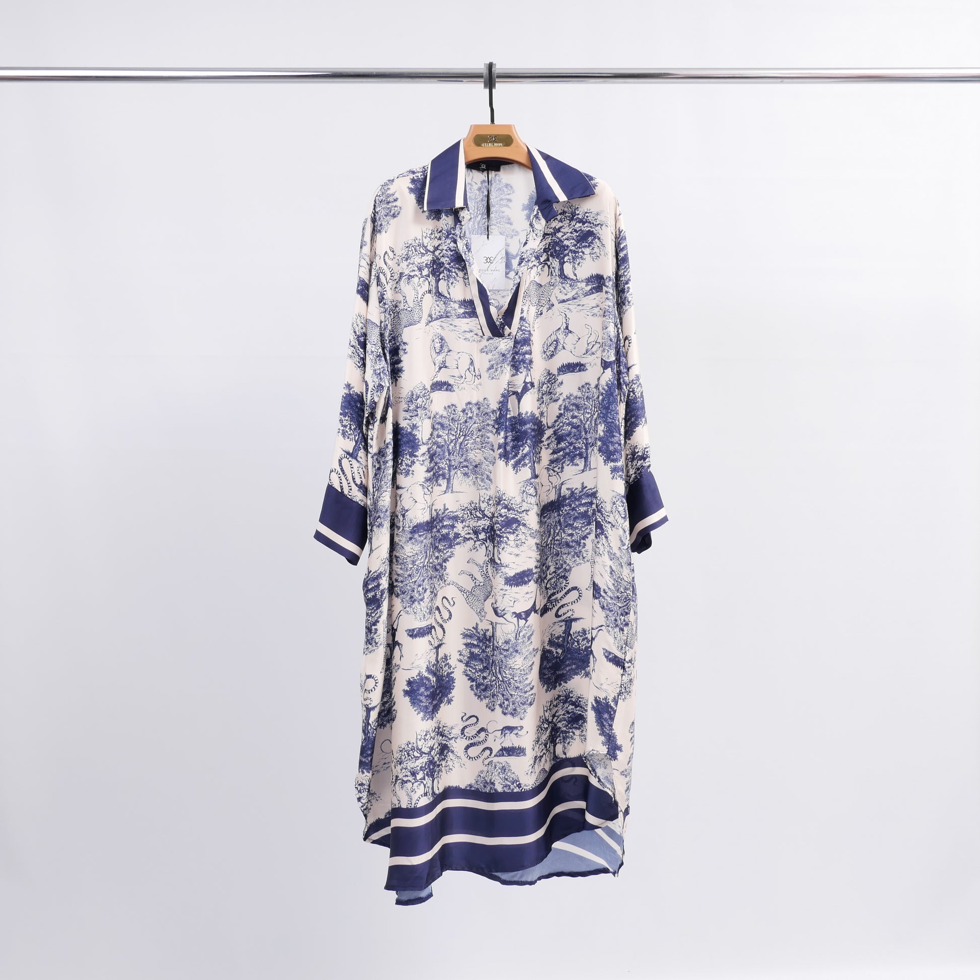 Un imprimé toile de Jouy revisité pour une allure élégante et intemporelle. Cette robe chemise fluide séduit par son col contrasté et ses manches 3/4 légèrement évasées, sublimés par des revers assortis. Sa coupe ample assure confort et liberté de mouvement tout en mettant en valeur la légèreté de la matière. Idéale portée seule avec des sandales pour un look estival chic, ou ceinturée à la taille avec des escarpins pour une silhouette plus sophistiquée.