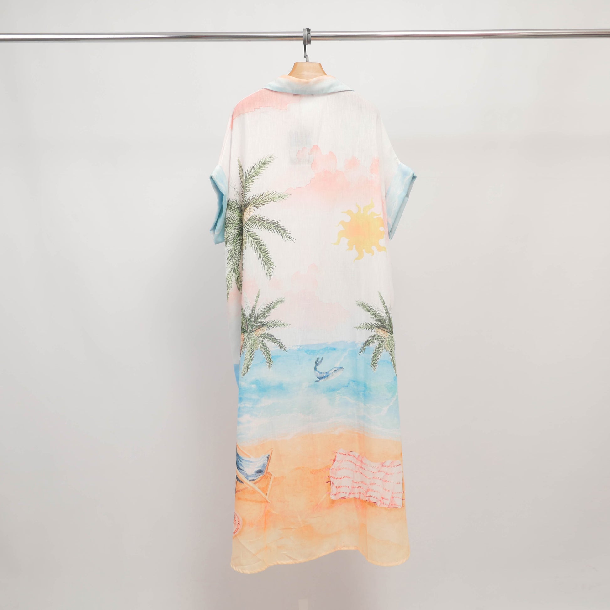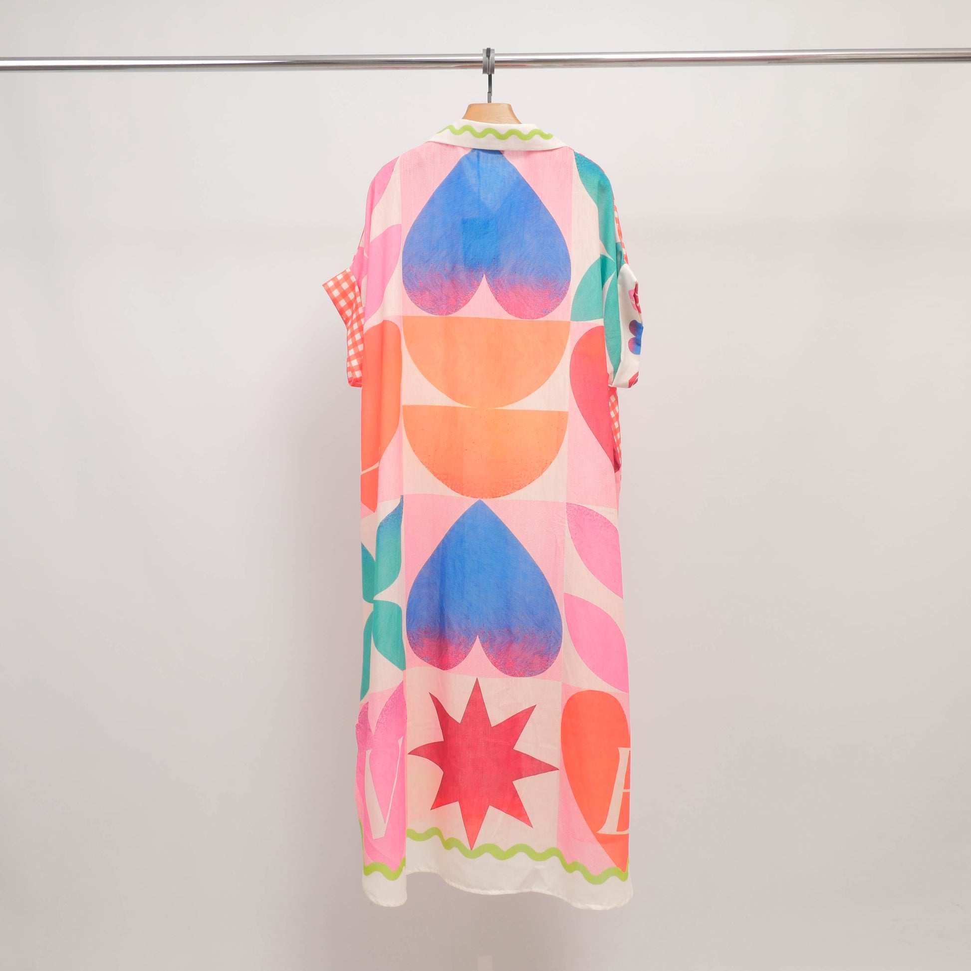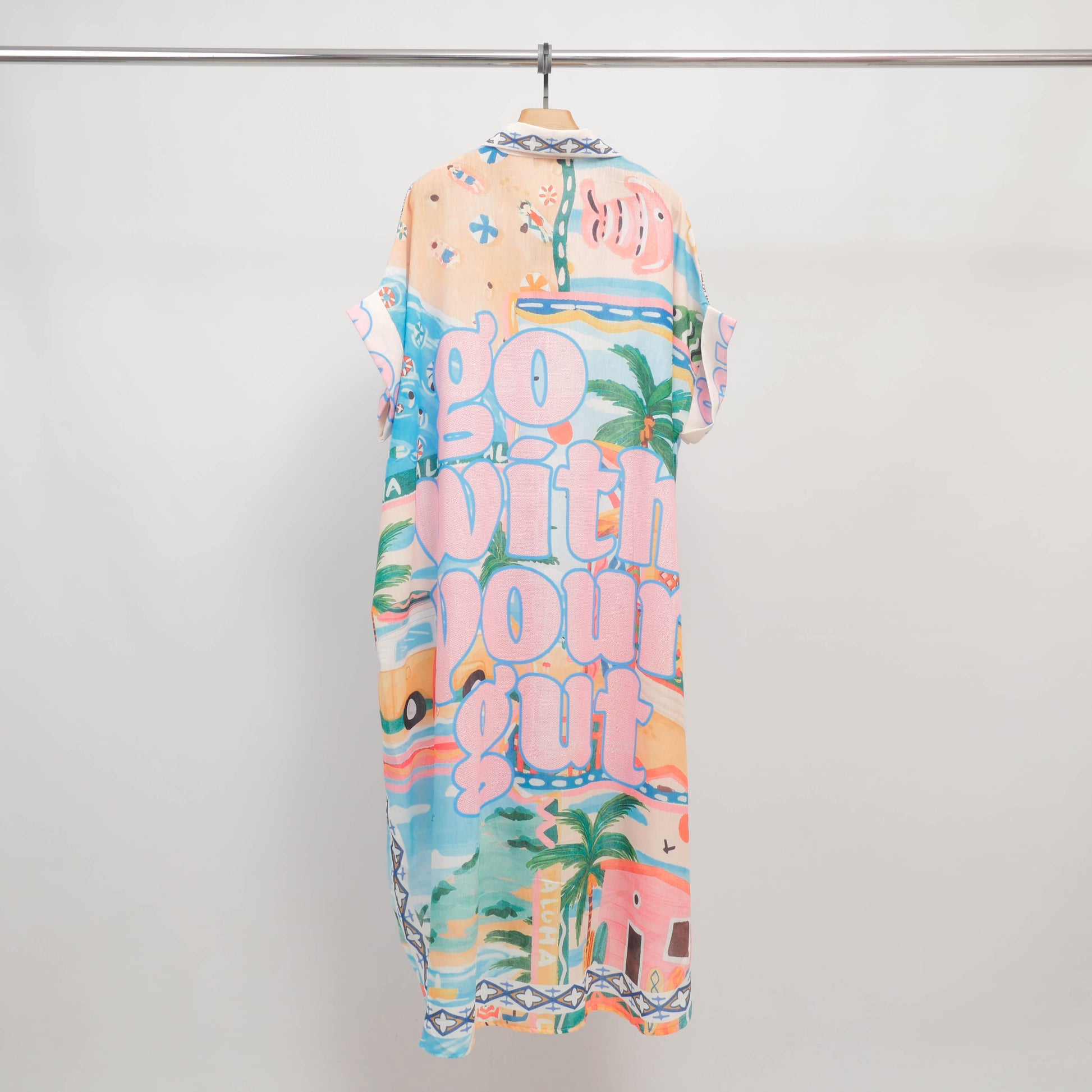 Offrez-vous une escapade colorée avec cette robe chemise oversize aux imprimés éclatants. Des paysages tropicaux aux illustrations poétiques en passant par des messages positifs, chaque modèle propose un univers graphique singulier et expressif. Sa coupe fluide et ample, son col classique et ses manches courtes en font une pièce facile à porter et ultra confortable.