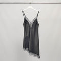 Le décolleté plongeant souligné de dentelle florale apporte une touche de raffinement, tandis que la coupe asymétrique et fluide met subtilement en valeur la silhouette. La matière satinée capte la lumière avec douceur pour un effet glamour tout en légèreté.