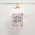 Ce t-shirt au design original mêle esprit casual et sophistication graphique avec brio. Il combine un jersey de coton doux et stretch pour le dos et les manches, à un panneau satiné imprimé façon foulard sur le devant, rehaussé d’un motif équestre coloré et d’un nœud fantaisie sur le côté. Sa coupe droite et fluide assure un tombé flatteur, tandis que le contraste des matières apporte relief et caractère à votre tenue. À porter avec un jean taille haute pour un look mode et décontracté, ou avec un pantalon palazzo pour une silhouette plus élégante.