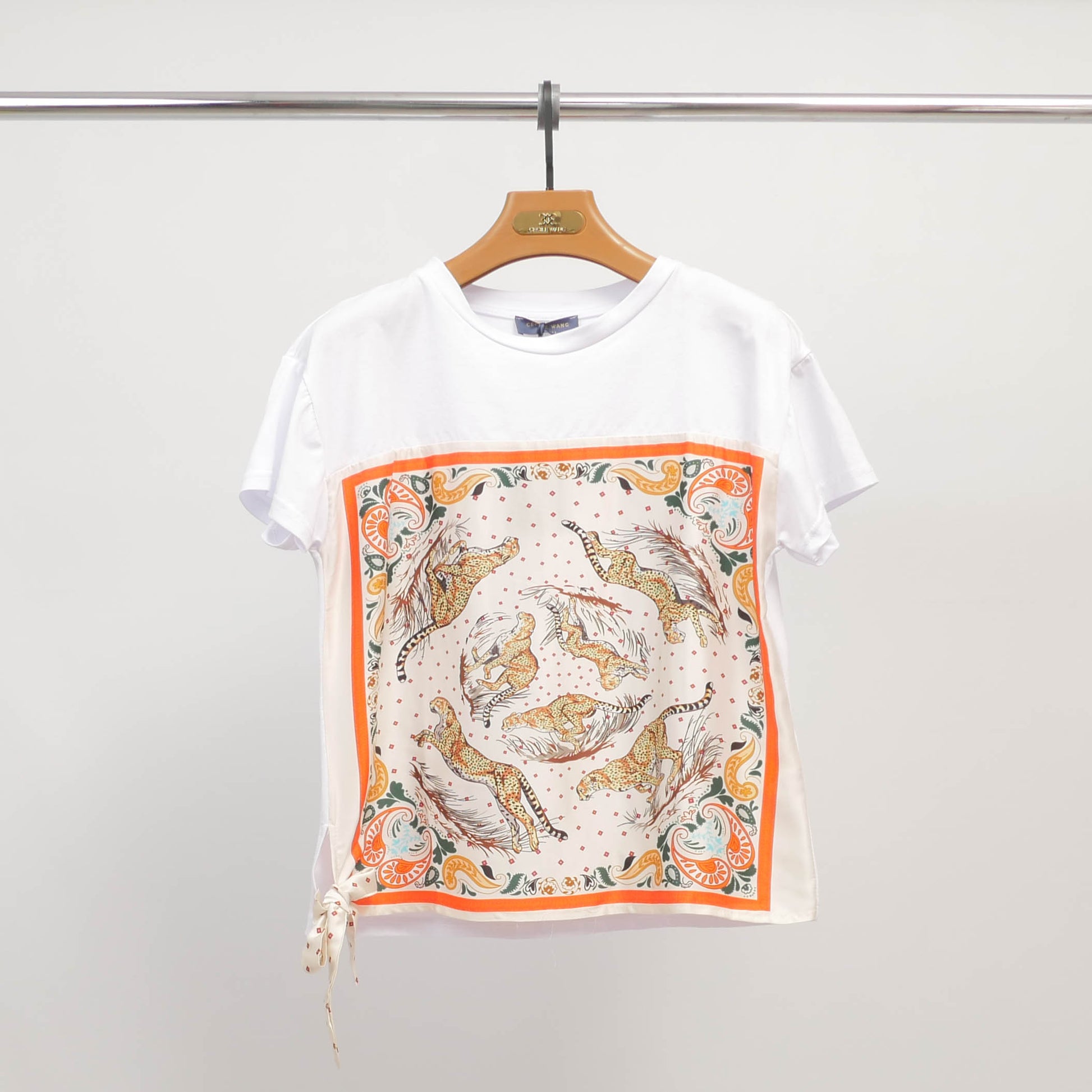 Un basique twisté qui allie confort et touche artistique. Ce t-shirt blanc se distingue par un empiècement façon foulard sur le devant, orné d’un motif félin élégant aux tons chauds et contrastés. Le petit nœud à la base vient ajouter une note féminine et originale à la silhouette.