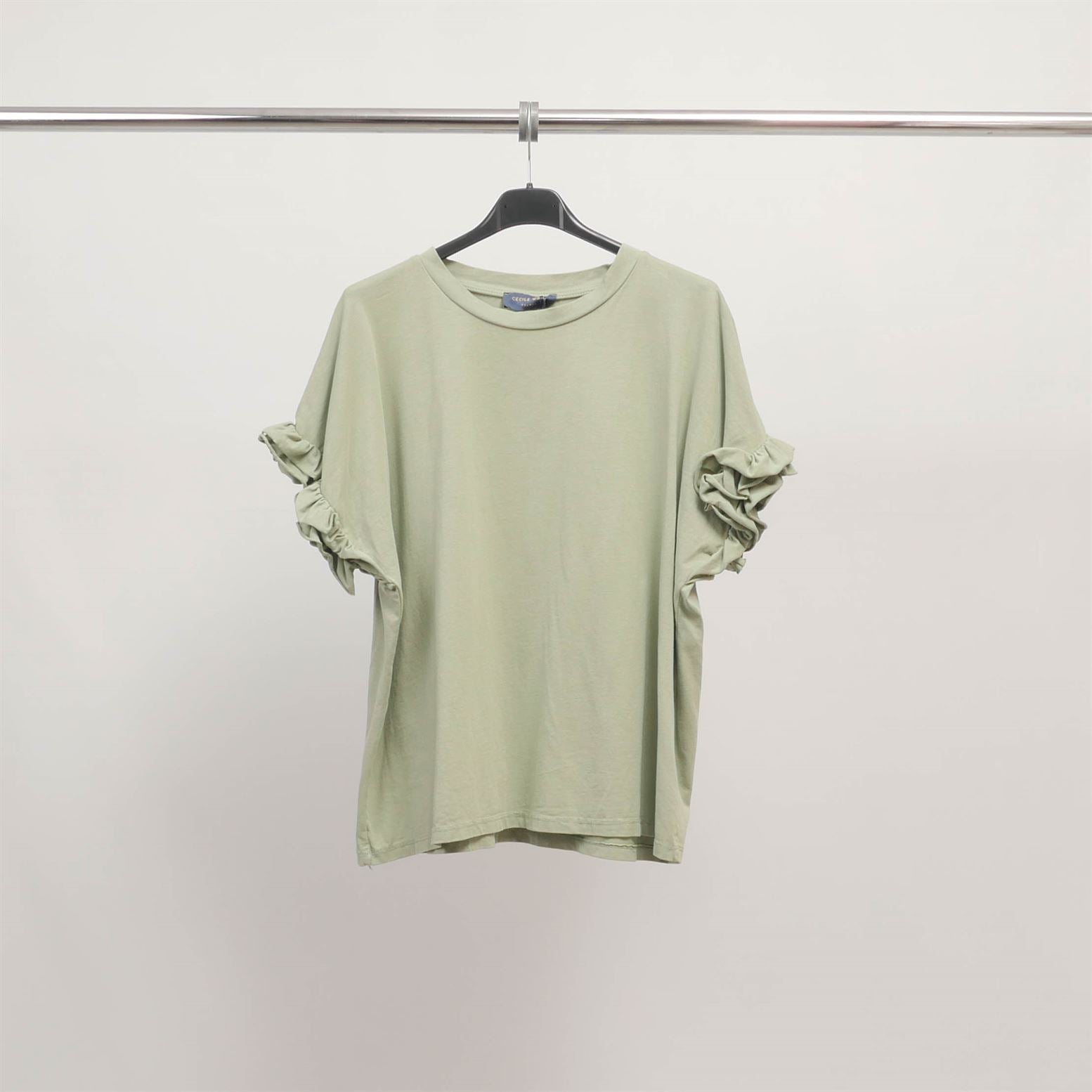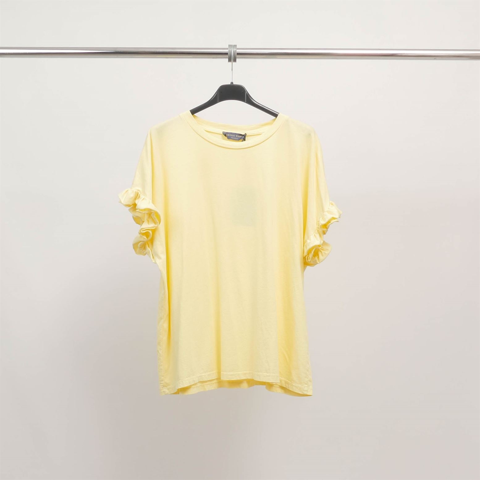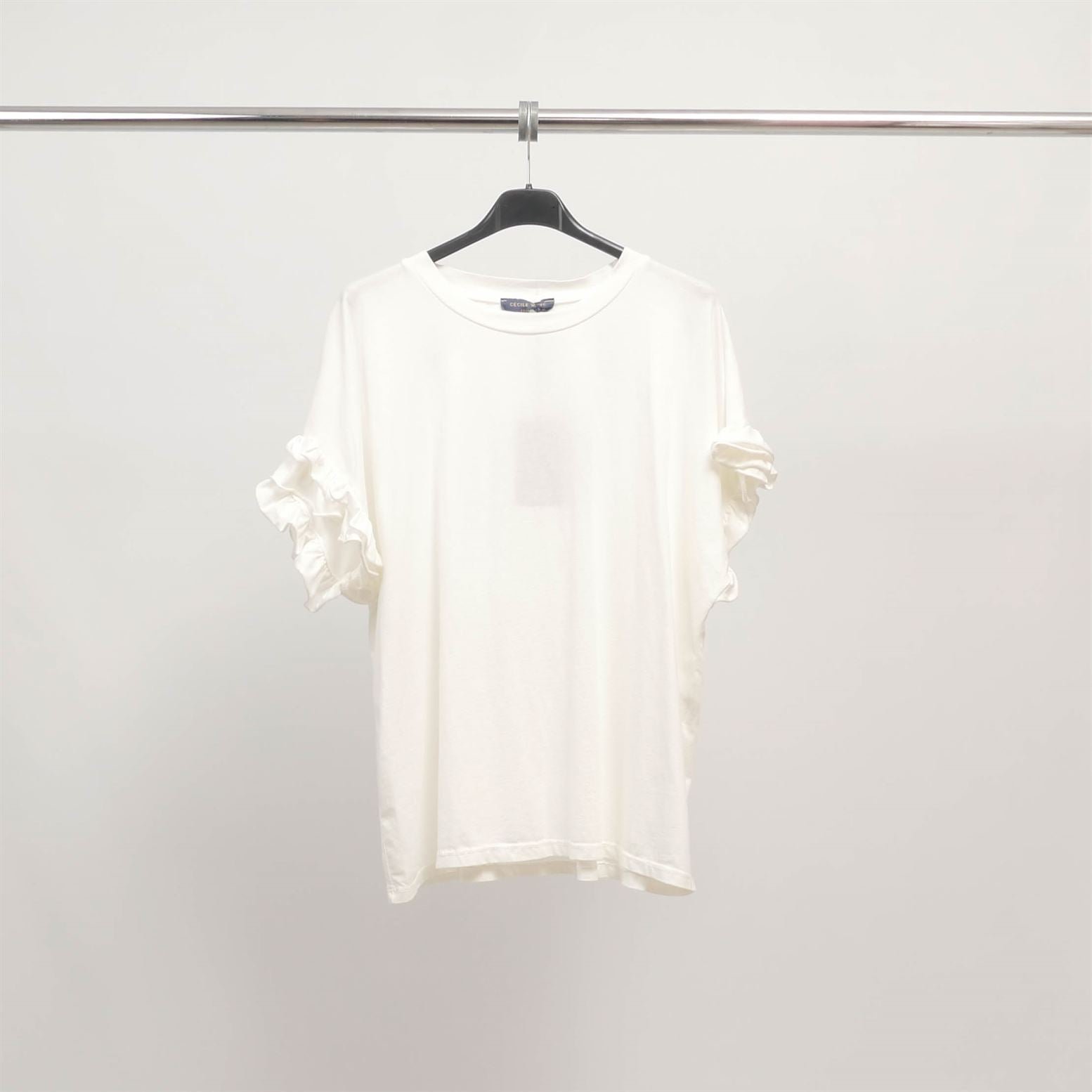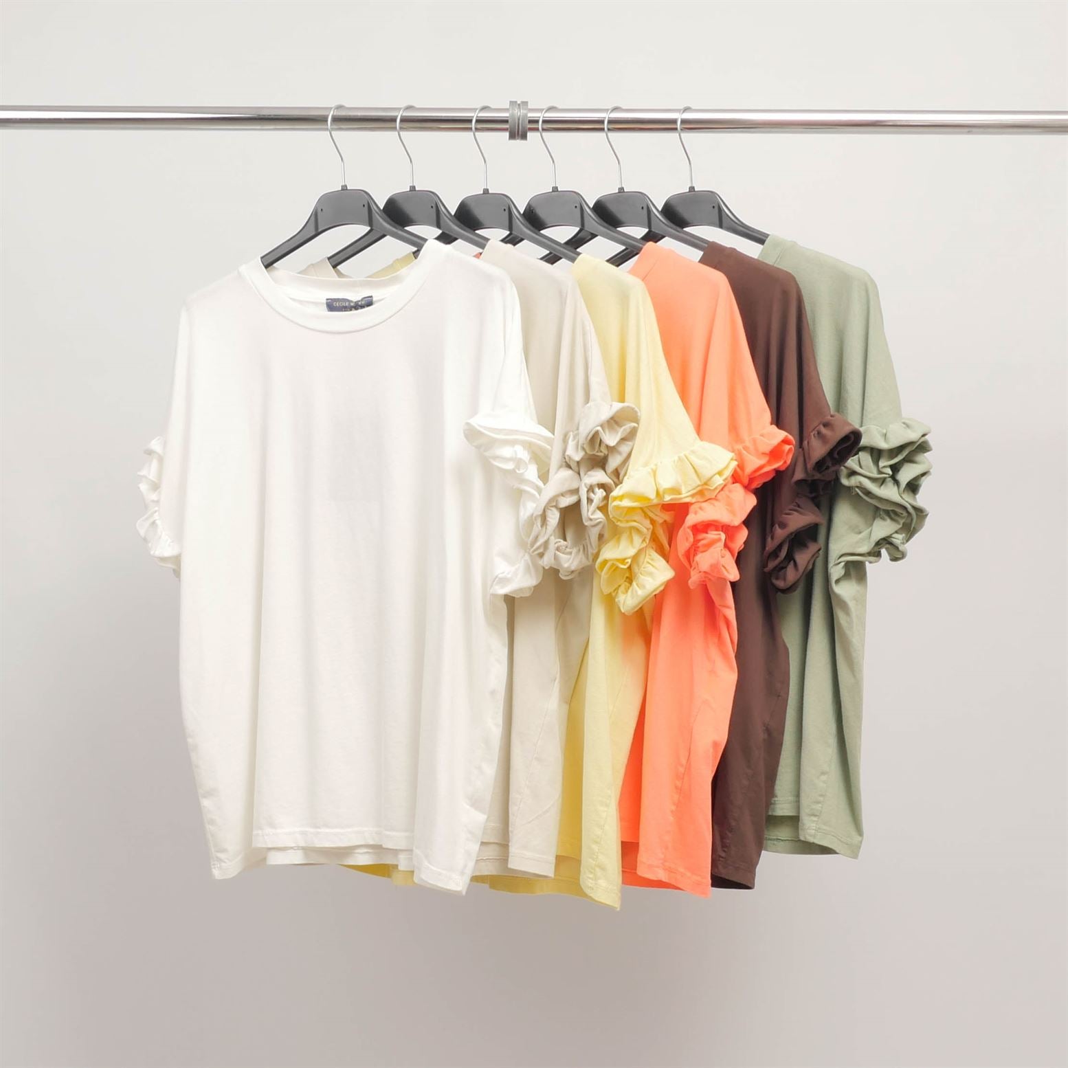 Un basique revisité avec une touche de féminité. Ce t-shirt en coton stretch se distingue par ses manches courtes ornées de volants délicats qui ajoutent du volume et du caractère à une coupe classique. Confortable et légèrement extensible, il épouse la silhouette sans la contraindre. Sa palette de couleurs douces ou vitaminées en fait un allié parfait pour toutes vos envies de style. À associer à un jean taille haute ou une jupe fluide pour un look casual chic.
